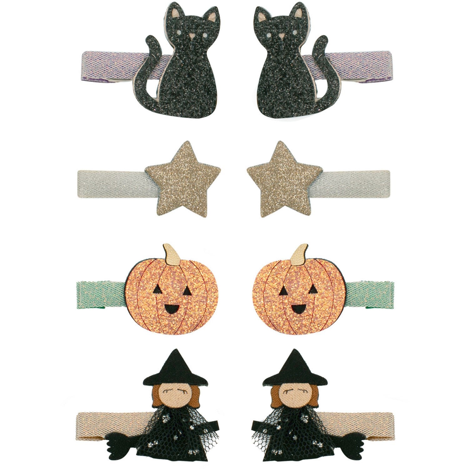 Lys opp Halloween for de minste med disse sjarmerende Mimi & Lula hårclipsene! Settet inneholder 4 par mini hårspenner, hver dekorert med festlige motiver av stjerner, katter, hekser og gresskar. Perfekte for å tilføye et magisk touch til ethvert antrekk, disse hårspennene er både stilig og praktisk for barnas bruk. Lett å feste og behagelig å ha på, de vil holde små hårstrå godt på plass gjennom alle høstens eventyr!