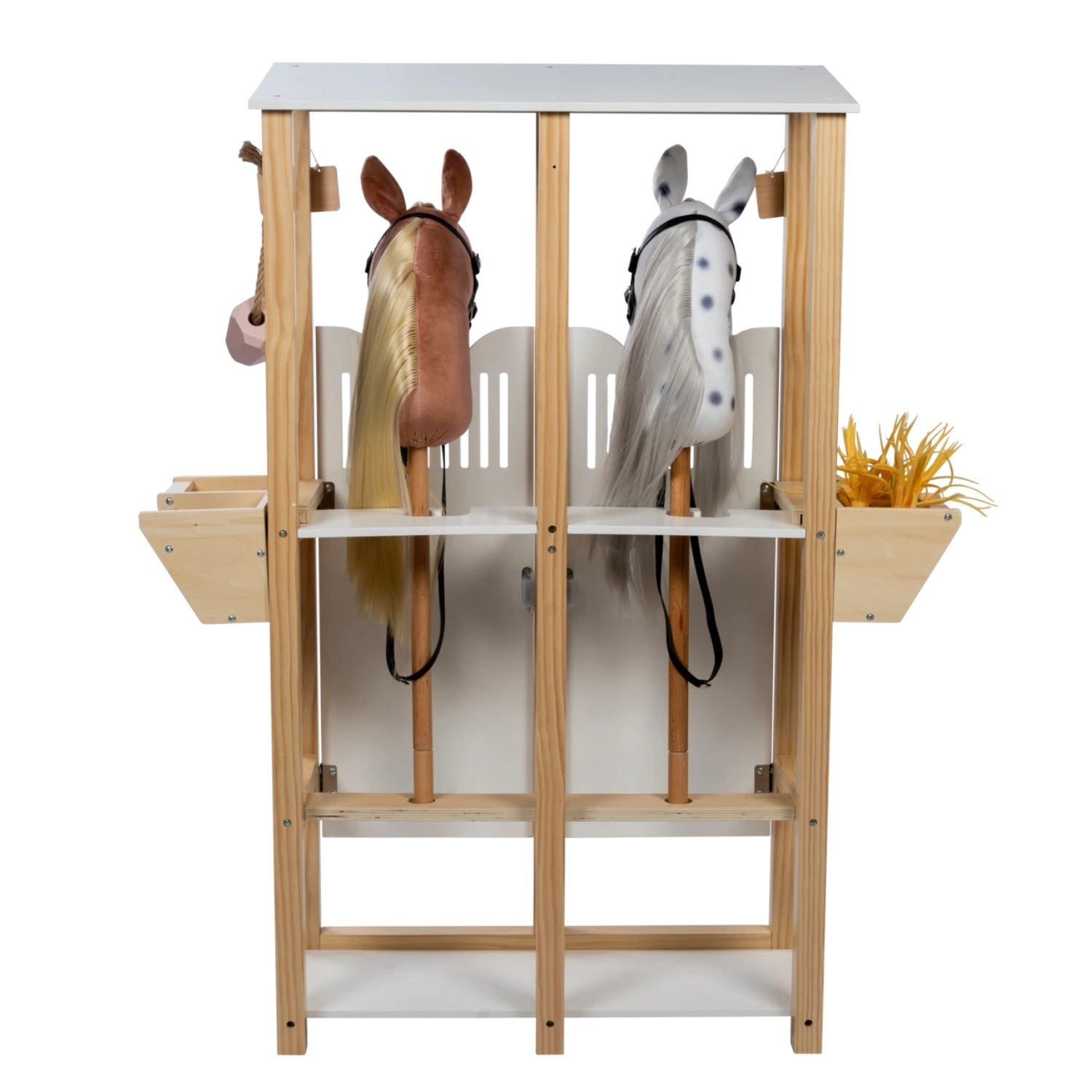 Oppdag vårt sjarmerende byASTRUP® hestestall - den ideelle tilføyelsen i lekesamlingen for ethvert barn som elsker kjepphester. Designet med tanke på lekenhet og funksjonalitet, tilbyr denne stallen et koselig hjem med plass til to kjepphester og smart arrangerte knagger for å holde styr på alt tilbehøret som grimer og rosetter.
