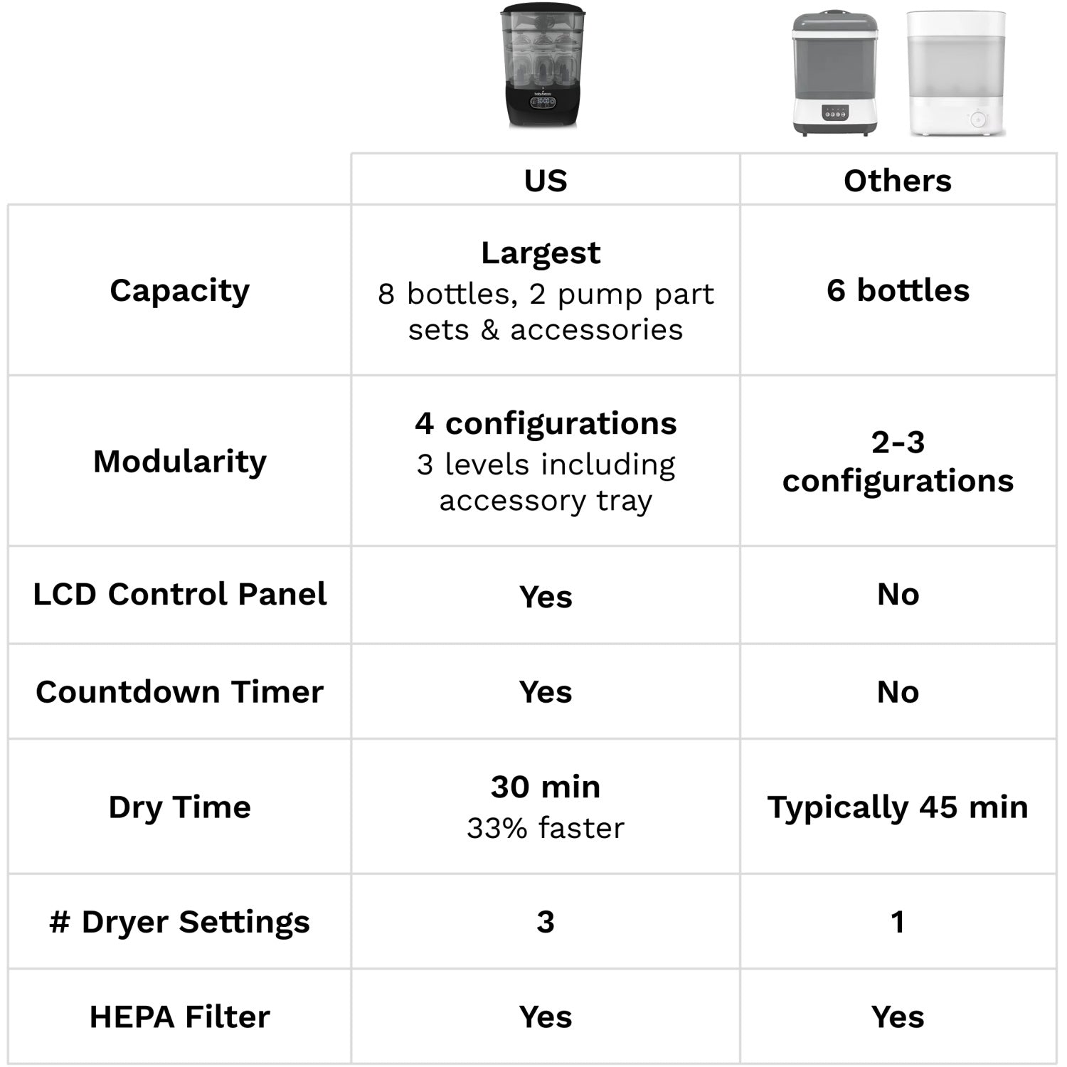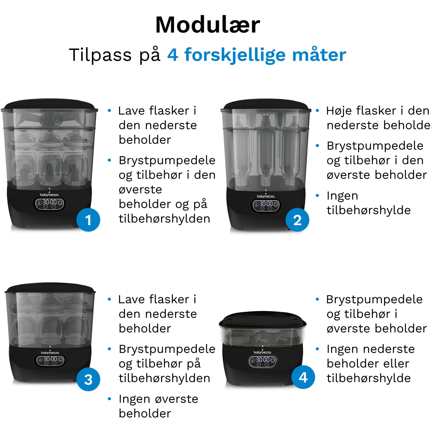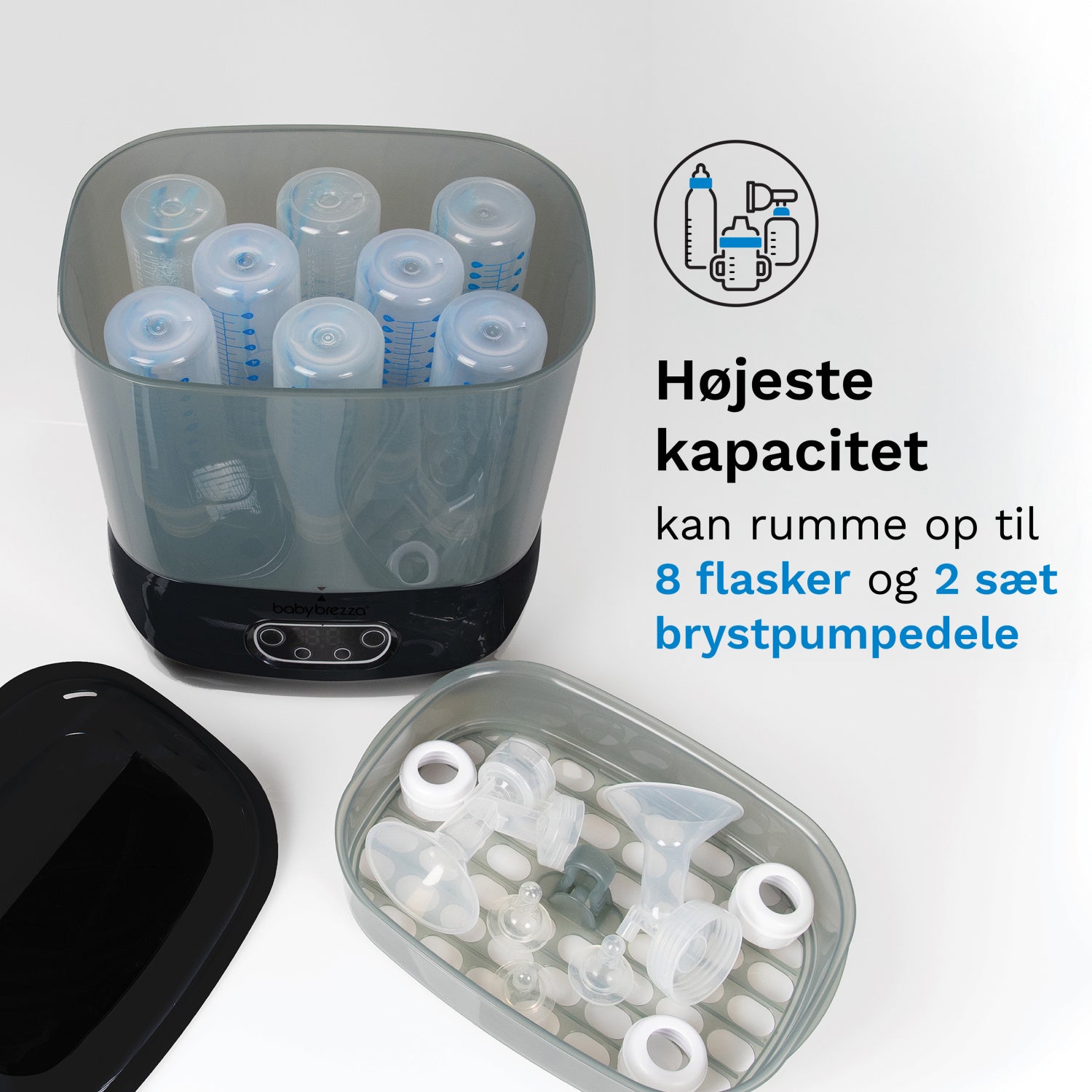 - Steriliserer og tørker automatisk flasker, tilbehør og brystpumpedeler