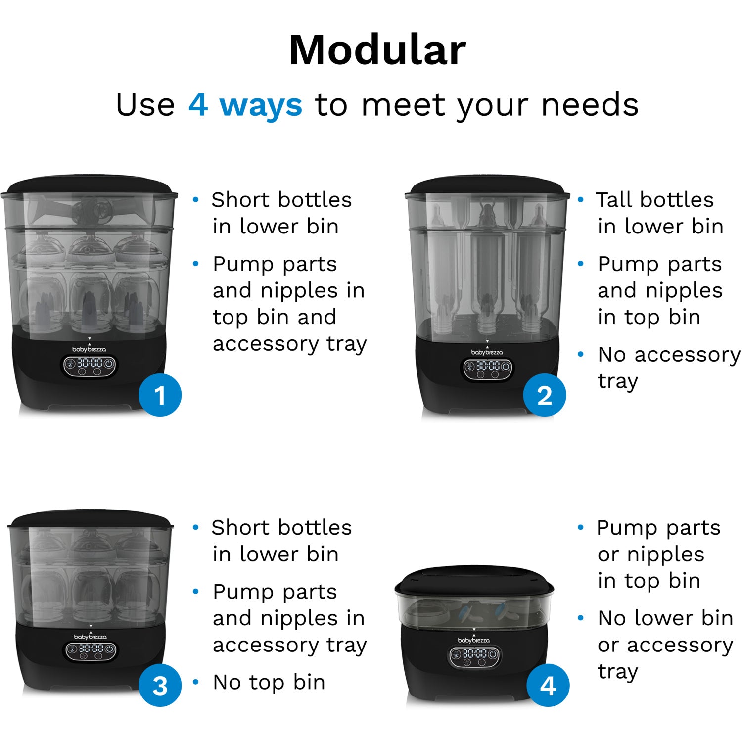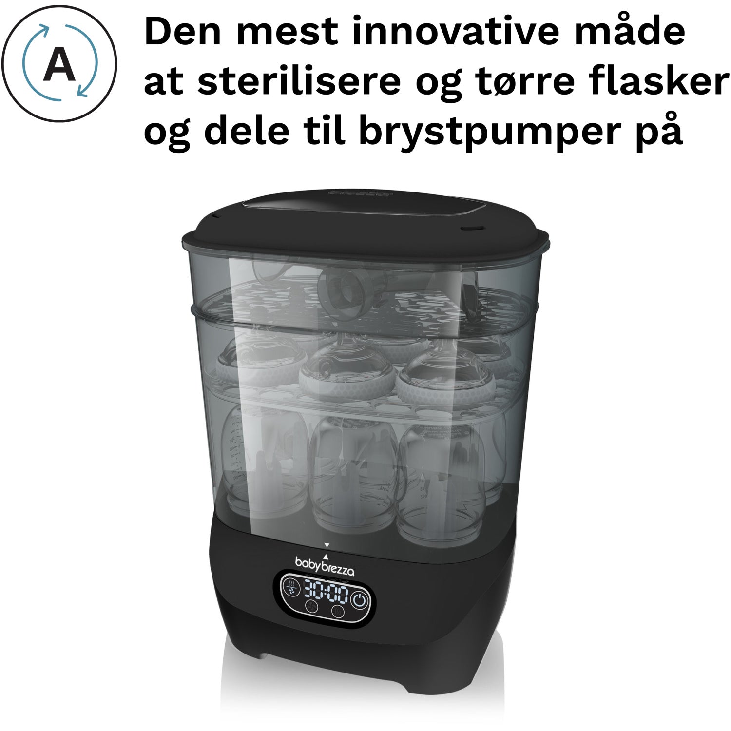 Oppdag Baby Brezza Black Sterilizer Dryer Advanced, den perfekte løsningen for sikker og effektiv sterilisering av sutteflasker og tilbehør. Med godkjente sikkerhetsfunksjoner og sertifiseringer, garanterer dette produktet en brukervennlig opplevelse kombinert med høy komfort. Det innovative designet tilbyr også fleksible oppbevaringsmuligheter og sikrer enkel vedlikehold. Dette gjør at du kan holde barneutstyret organisert mens barnets sanser stimuleres og underholdes. En ideell hjelper for travel hverdag med småbarn!