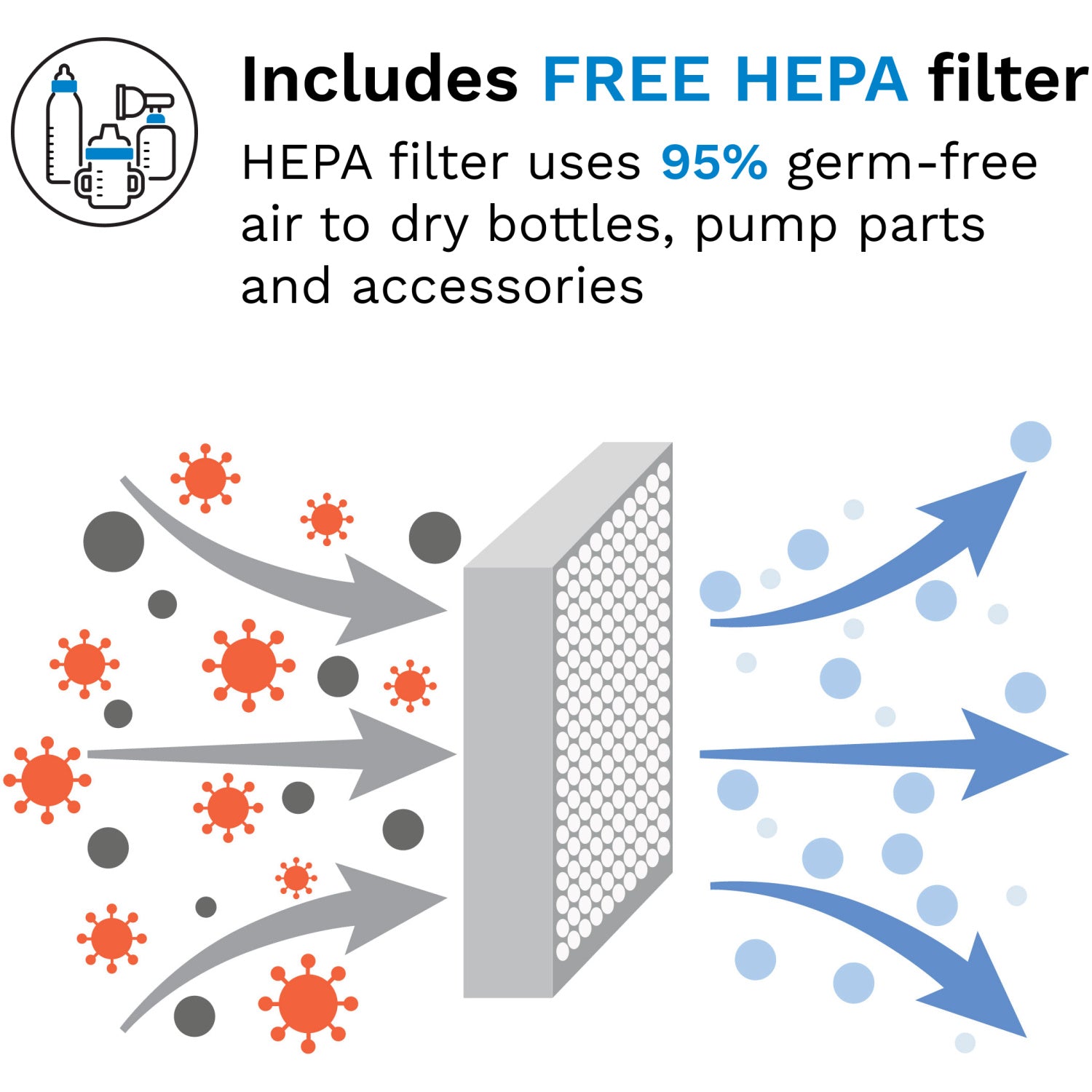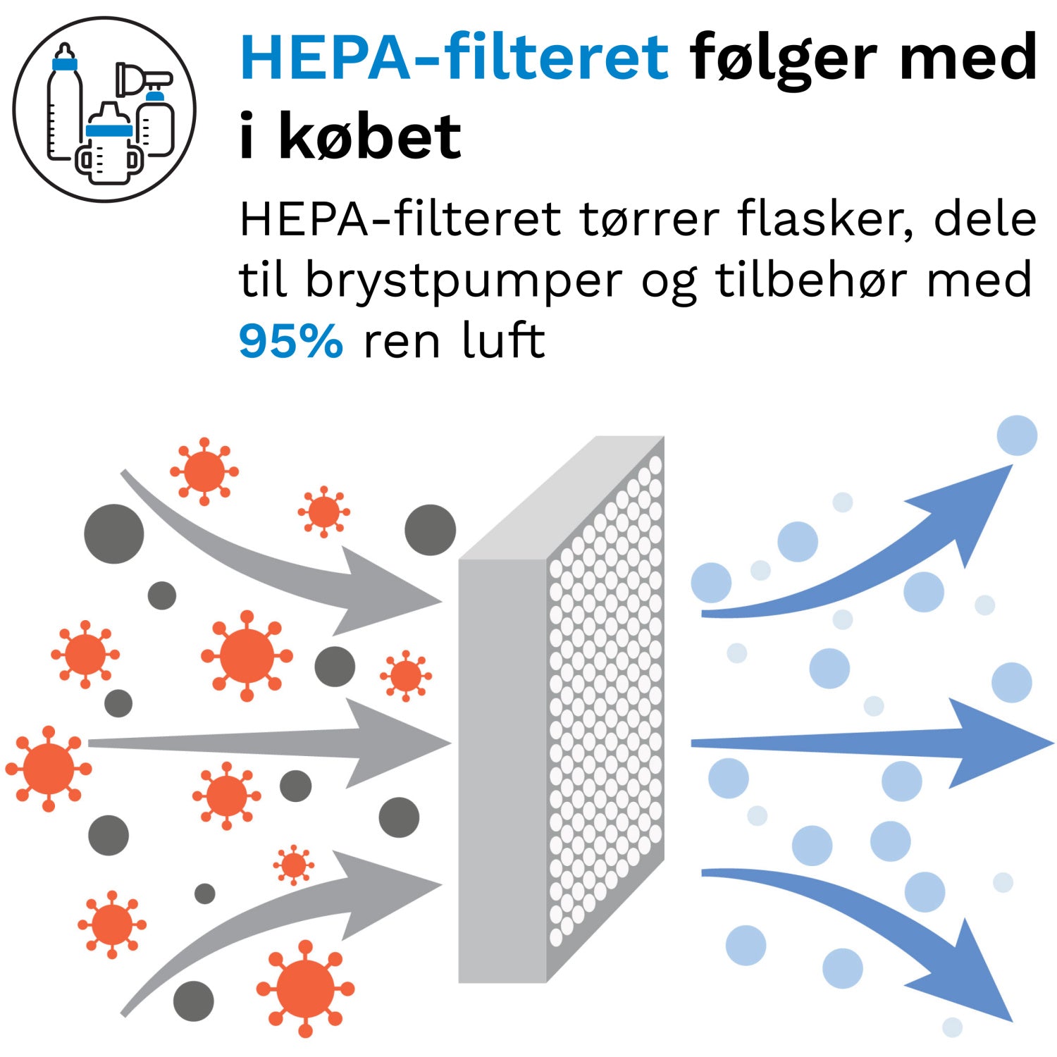 - Inkluderer et utskiftbart HEPA-filter slik at det tørker alle deler med 95 % bakteriefri luft.