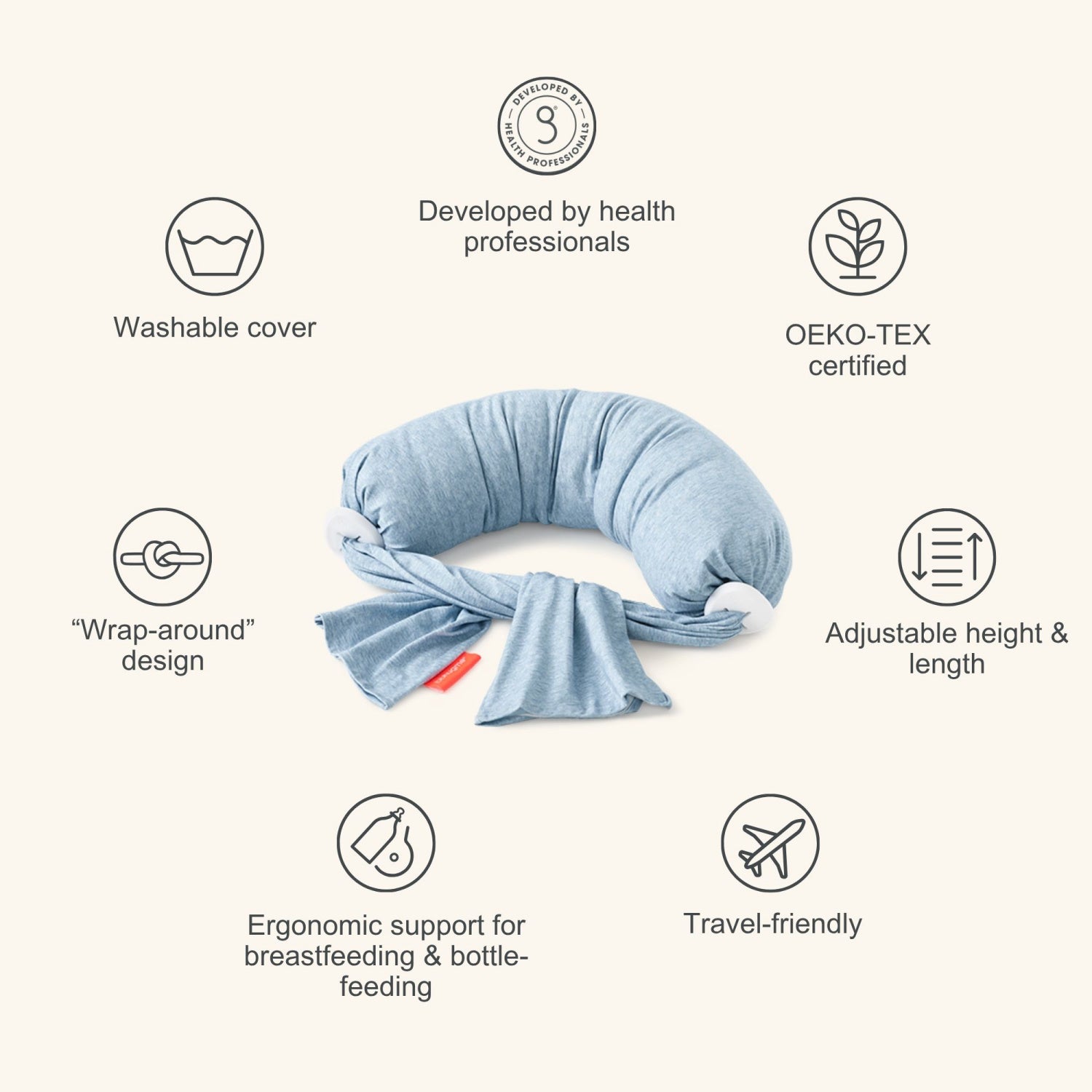 Kun beregnet for amming og flaskemating. La aldri babyen din være uten tilsyn med ammeputen. Babyer bør aldri sove på eller med ammeputen på grunn av risikoen for kvelning. Tilsyn kreves av en våken, oppmerksom voksen. Ikke la barn glide opp puten, da de indre mikroperlene kan utgjøre en kvelningsfare. Ikke bruk ammeputen mens du står.