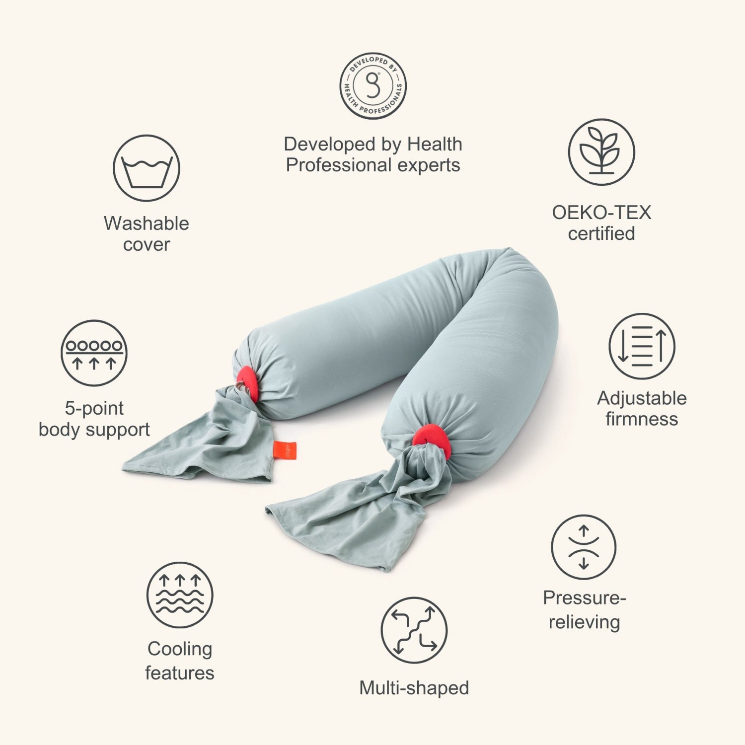 Designet til komfort, søvn og støtte kun for voksne. Efterlad aldrig din baby uden opsyn med graviditetspuden. Babyer bør aldrig sove på eller med graviditetspuden på grund af risikoen for kvælning. Lad ikke børn lyne puden op, da de indvendige mikroperler kan udgøre en kvælningsfare.