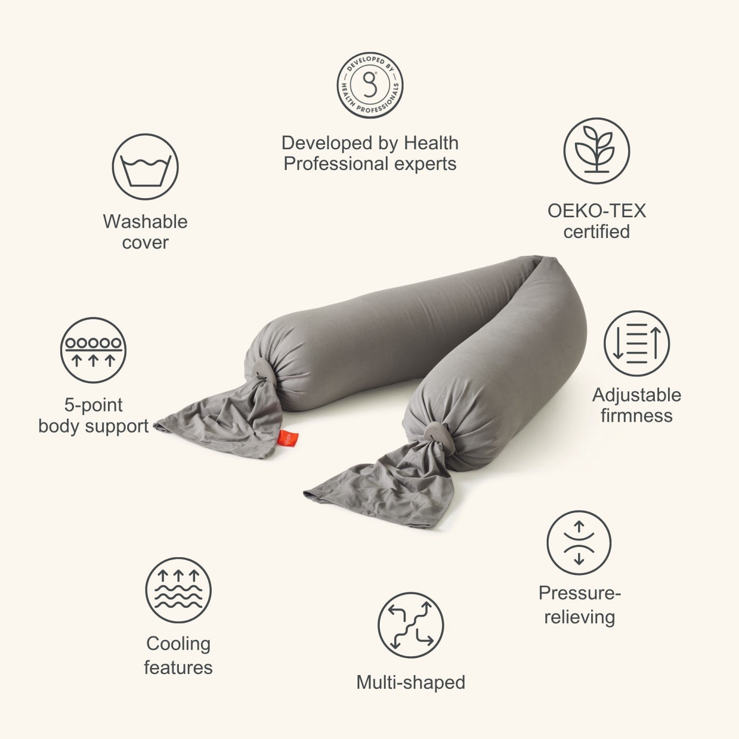 Designet til komfort, søvn og støtte kun for voksne. Efterlad aldrig din baby uden opsyn med graviditetspuden. Babyer bør aldrig sove på eller med graviditetspuden på grund af risikoen for kvælning. Lad ikke børn lyne puden op, da de indvendige mikroperler kan udgøre en kvælningsfare.