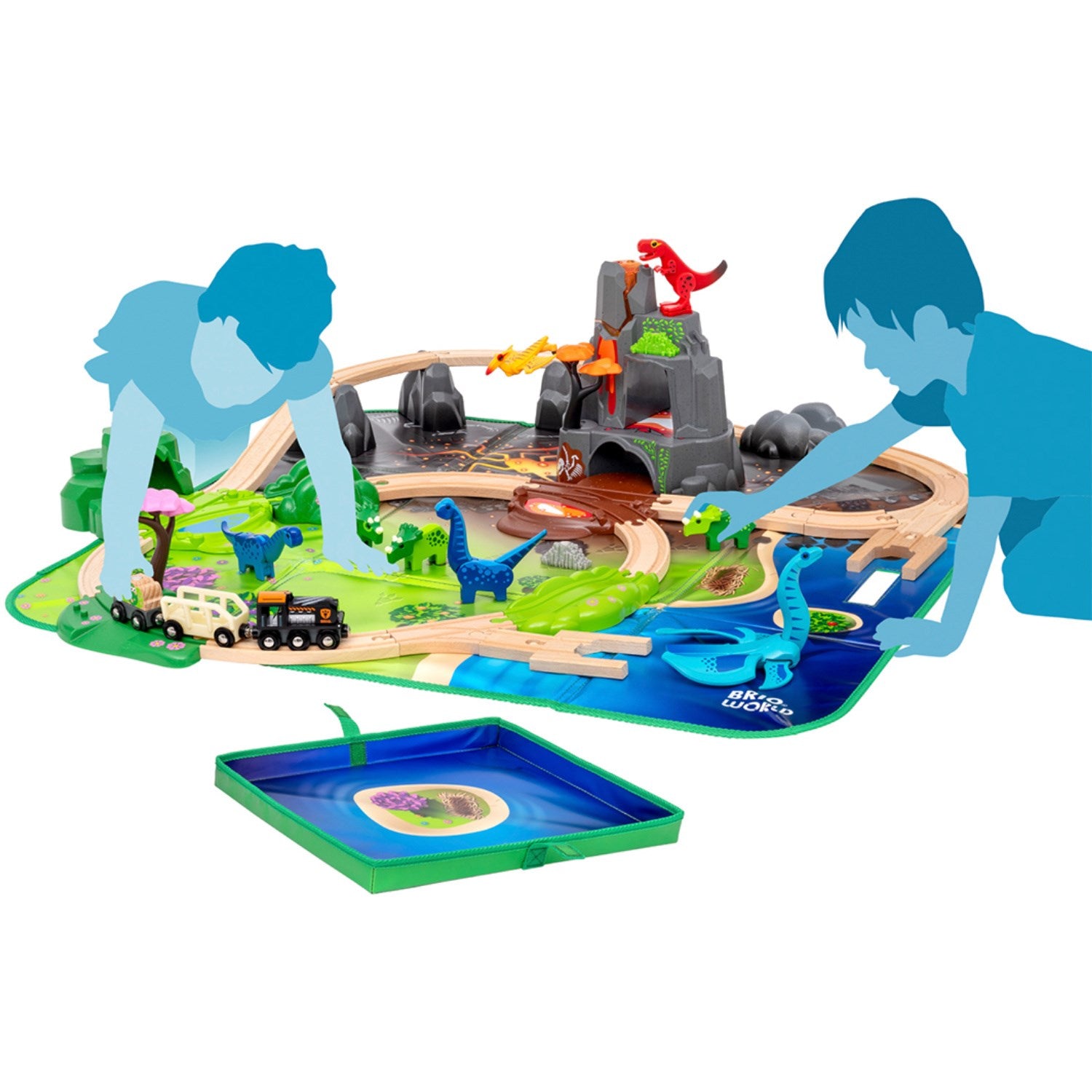 Utforsk forhistoriske eventyr med BRIO® 36104 Dinosaur Deluxe Set! Dette togsettet inviterer barna til en fantasifull reise tilbake til dinosaurenes tid med 44 deler full av oppdagelser og underholdning. Et høydepunkt er vulkanen som gir fra seg lys, lyd og tåke, noe som skaper en autentisk atmosfære. Inkludert i settet er åtte fargerike dinosaurfigurer med bevegelige ledd, ideelle for å stimulere barnas motoriske ferdigheter og kreativitet gjennom interaktiv lek. Med de klassiske BRIO-magnetene kan barn enkelt koble delene sammen, noe som fremmer både samarbeid og uavhengig lek.