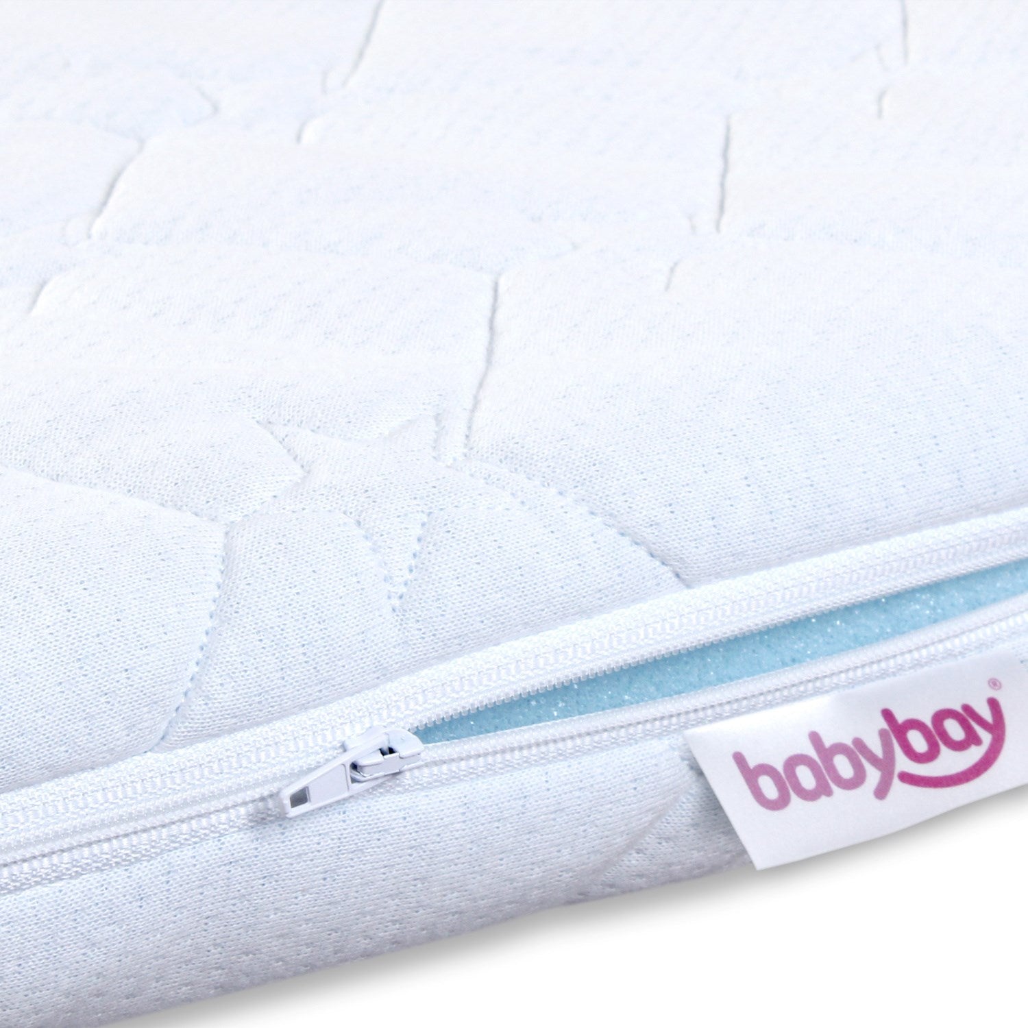 Tilføyd komfort kommer fra den nøye strukturerte bølgekonturen i skumkjernen som tilpasser seg babyens kropp, og det vakkert quiltede stjernemønsteret i trekket som kan vaskes enkelt ved 60 °C, takket være den praktiske tresidige glidelåsen. babybay® MediTex® Wave gir ikke bare uovertruffen komfort, men også enkel vedlikehold, noe som gjør den til en ideell løsning for travle foreldre.