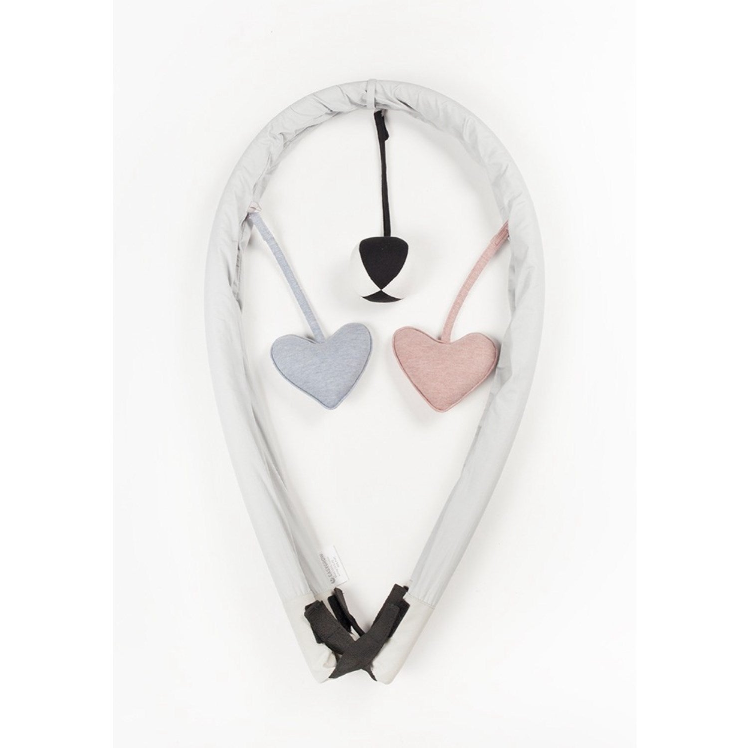 Leveres med mykt tekstilleketøy som er lett å fjerne, ball med bjelle og hjerte