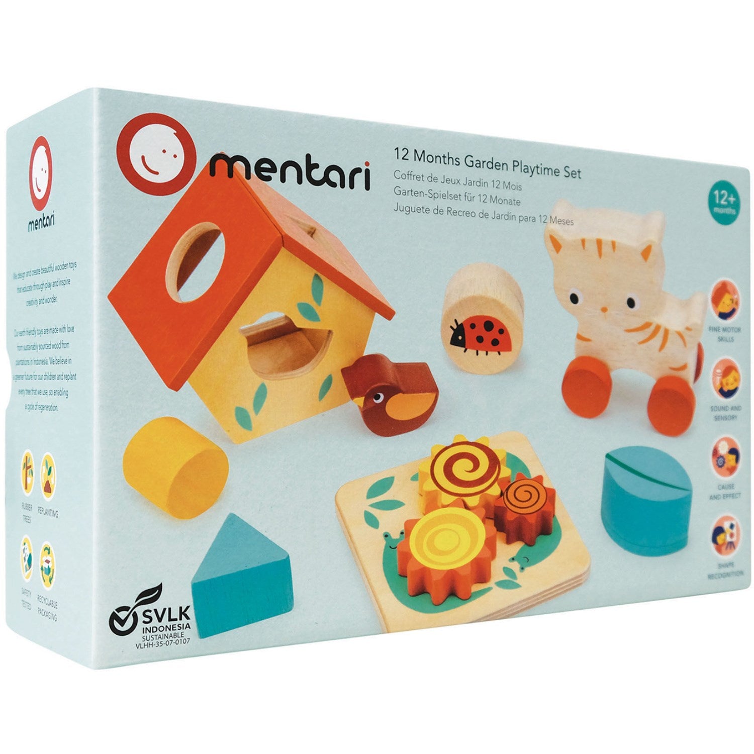 Gjør klar for fascinerende eventyr i hagen med Mentari Sparkel Boks Sett Hage Tema! Dette unike puttekassesettet er skreddersydd for små utforskere i alderen 12-18 måneder og tilbyr fem engasjerende aktiviteter som fremmer tidlig læring gjennom lek. Kassen inkluderer et fuglehus-formet hus for formgjenkjenning, et tannhjulbrett som forbedrer finmotorikken, en lettmanøvrerbar katt på hjul som introducerer bevegelseskonsepter, en munter marihøne som klirrer ved berøring, og en kreativ bladformet murstein fylt med raslende kuler.
