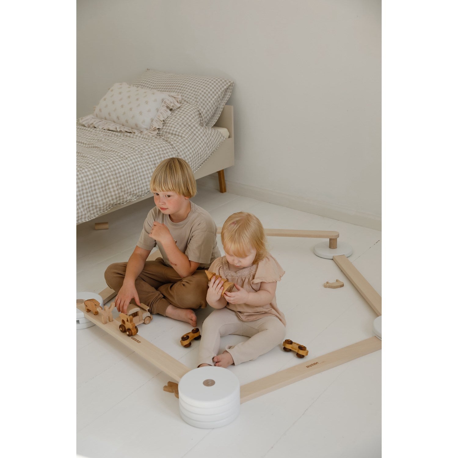 Hver komponent i settet er designet for å engasjere og interagere, stimulere både kropp og sinn. Holdbarheten sikres av robust heltre bøk, mens enkelheten i oppsett og vedlikehold garanterer ubekymret bruk. Selv etter lek er Woobiboo Olimpic XL lett å flytte, lagre og vedlikeholde, noe som gjør det ideelt for ethvert hjem.