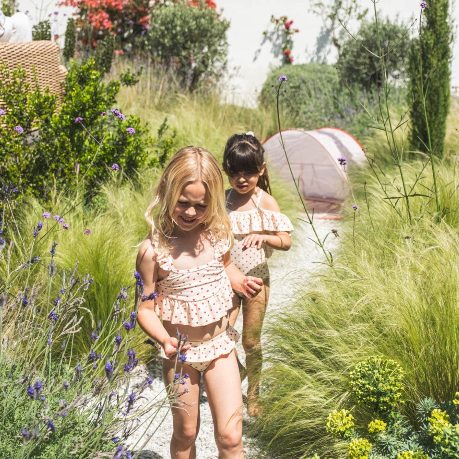 Oppdag den sjarmerende Saga-bikinien fra That's Mine, en perfekt kombinasjon av stil og funksjonalitet for de små. Denne vakre bikinien er laget av resirkulert polyester og fremhever miljøbevissthet. Med sine tre forskjellige håndlagde trykk tilbyr den et unikt og øyefangende utseende. Saga-bikinien er designet med nydelige volanger som tilfører et lekent og stilfullt preg.