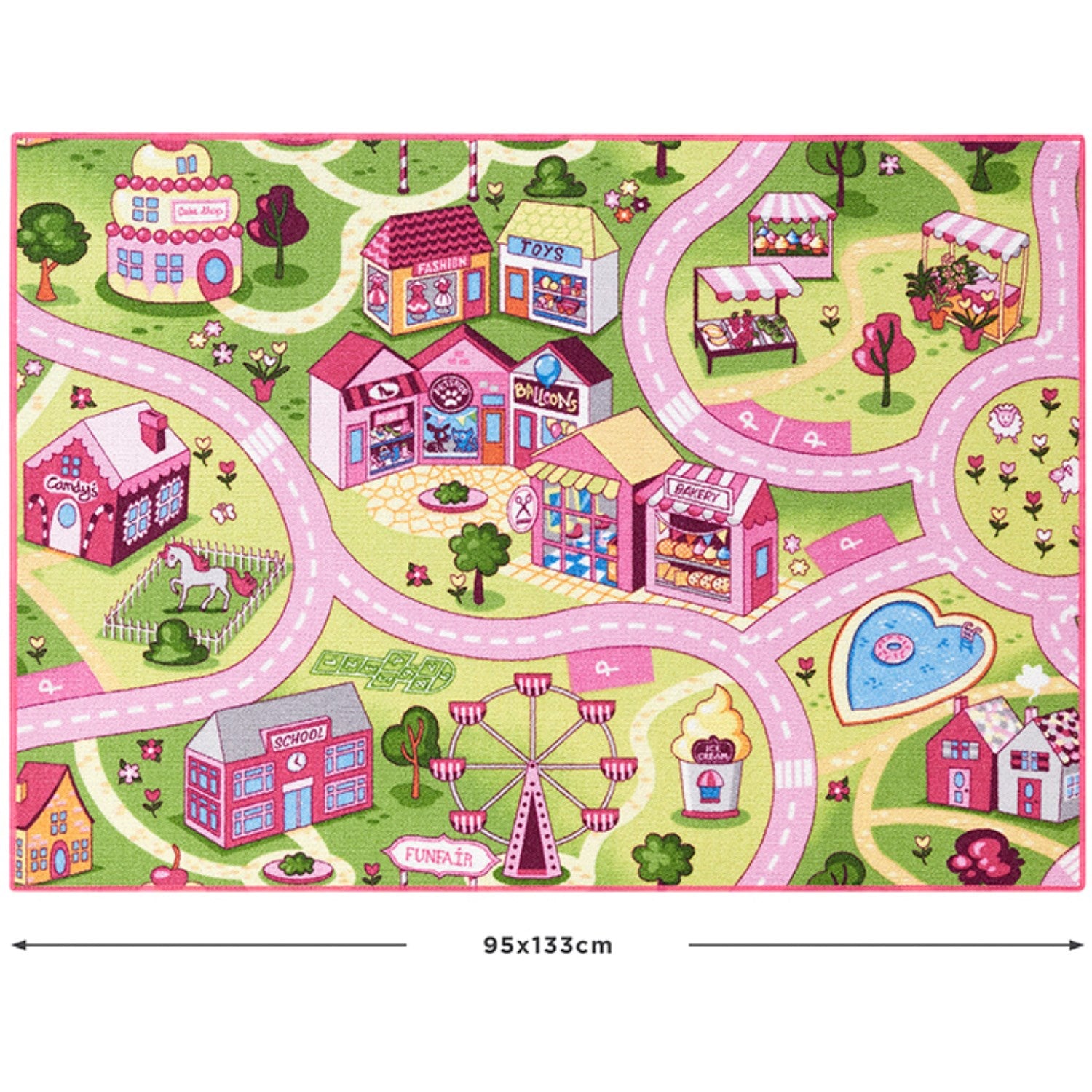 Teppet måler 95 x 133 cm og er fremstilt av slitesterk polyamid med en sklisikker underside av lateks, som sikrer stabilitet selv under livlig lek. Den lave luggen gjør det enkelt å vedlikeholde — en rask omgang med støvsuger eller en tørk med en fuktig klut holder det rent og pent.