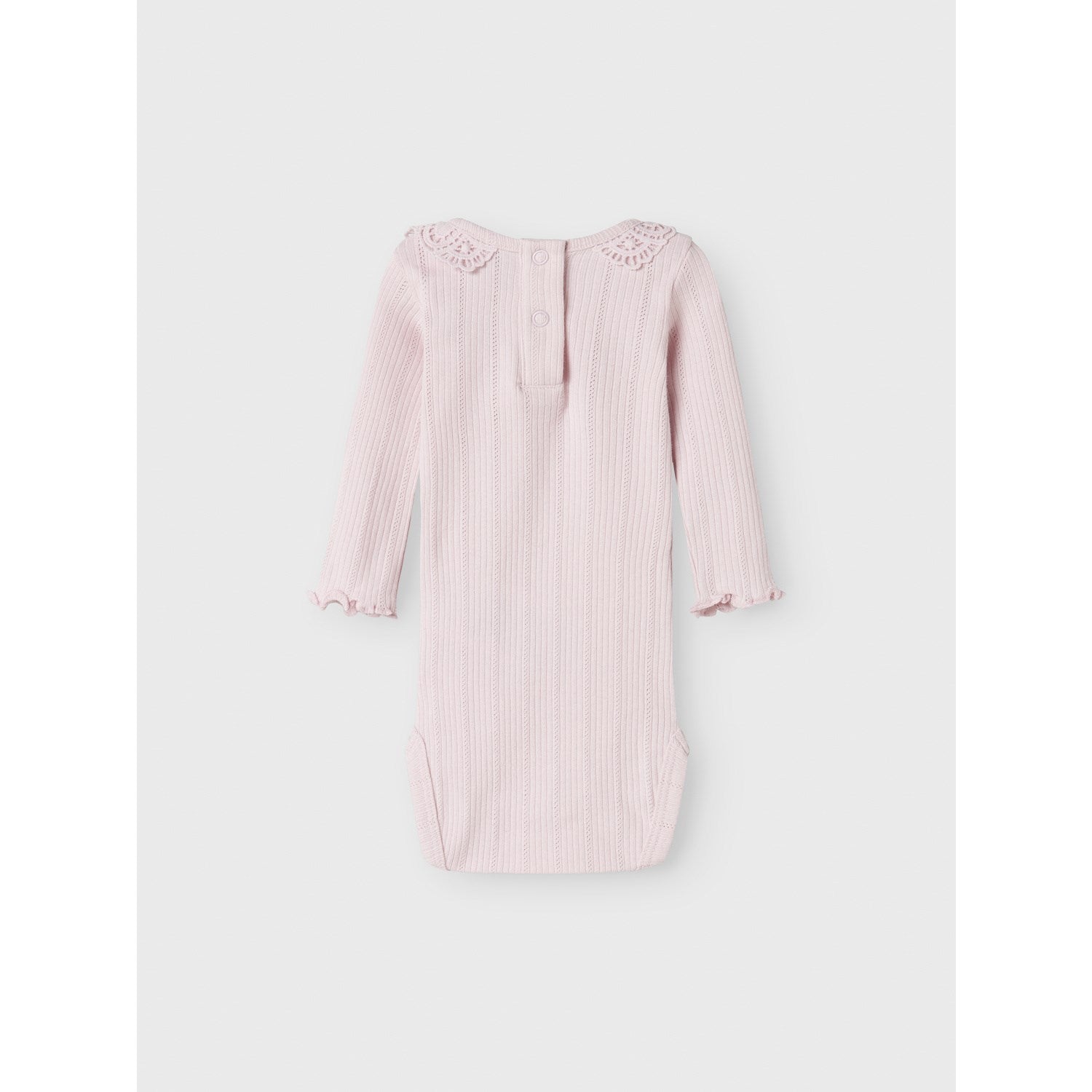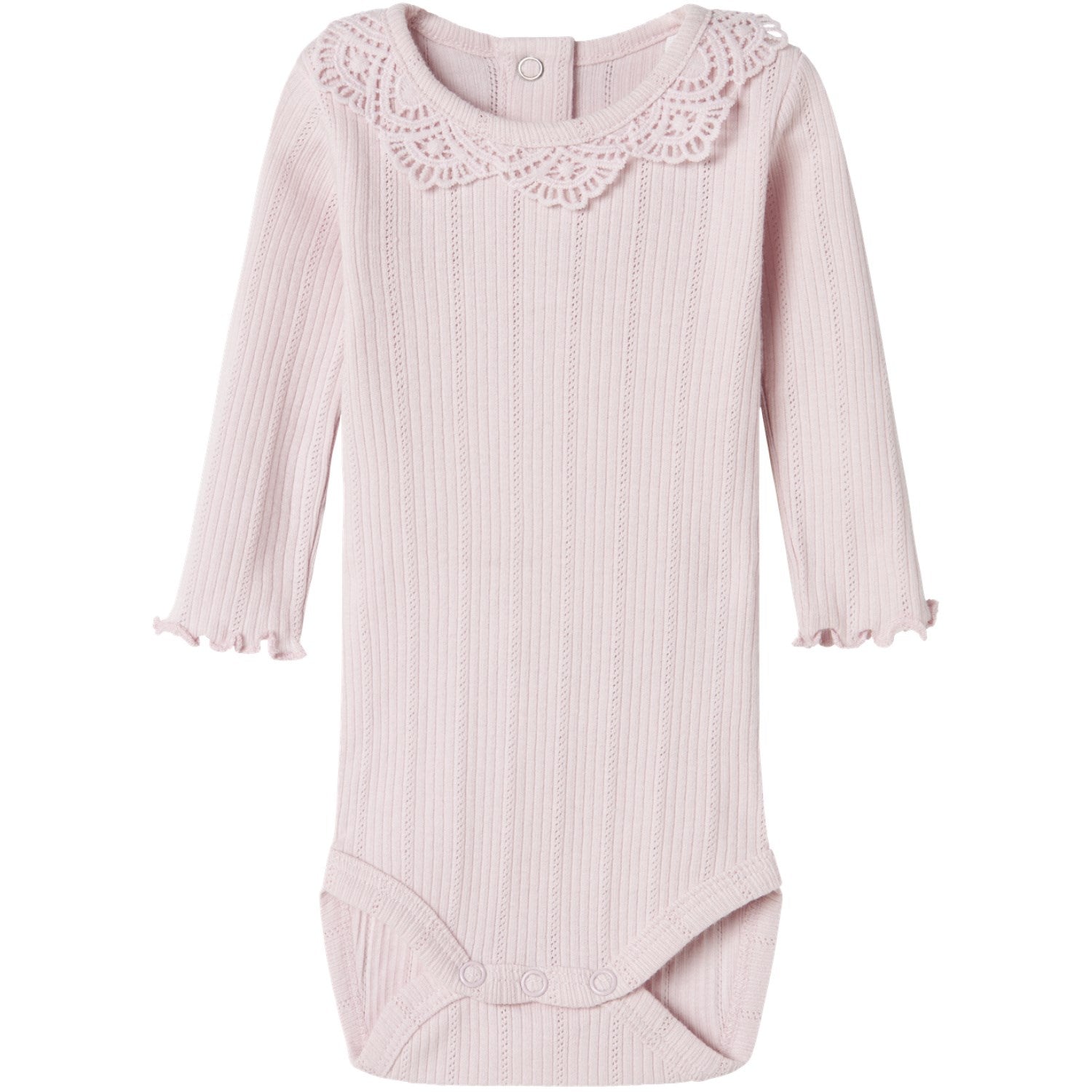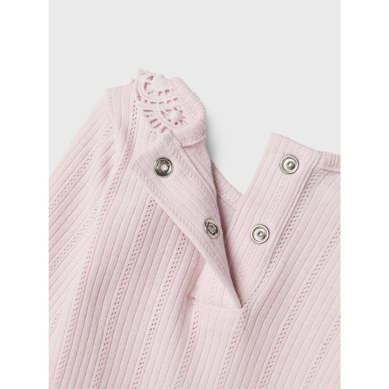 Frisk opp den lille sin garderobe med en elegant og behagelig Name It Light Lilac Dia Body. Denne sjarmerende bodysuiten er laget med et luftig pointelle-strikk, som kombinerer komfort med et delikat geometrisk mønster og franske mansjetter for et stilfullt preg. Den lyse lillafargen og de delikate blondedetaljene tilfører et søtt og stilig utseende.