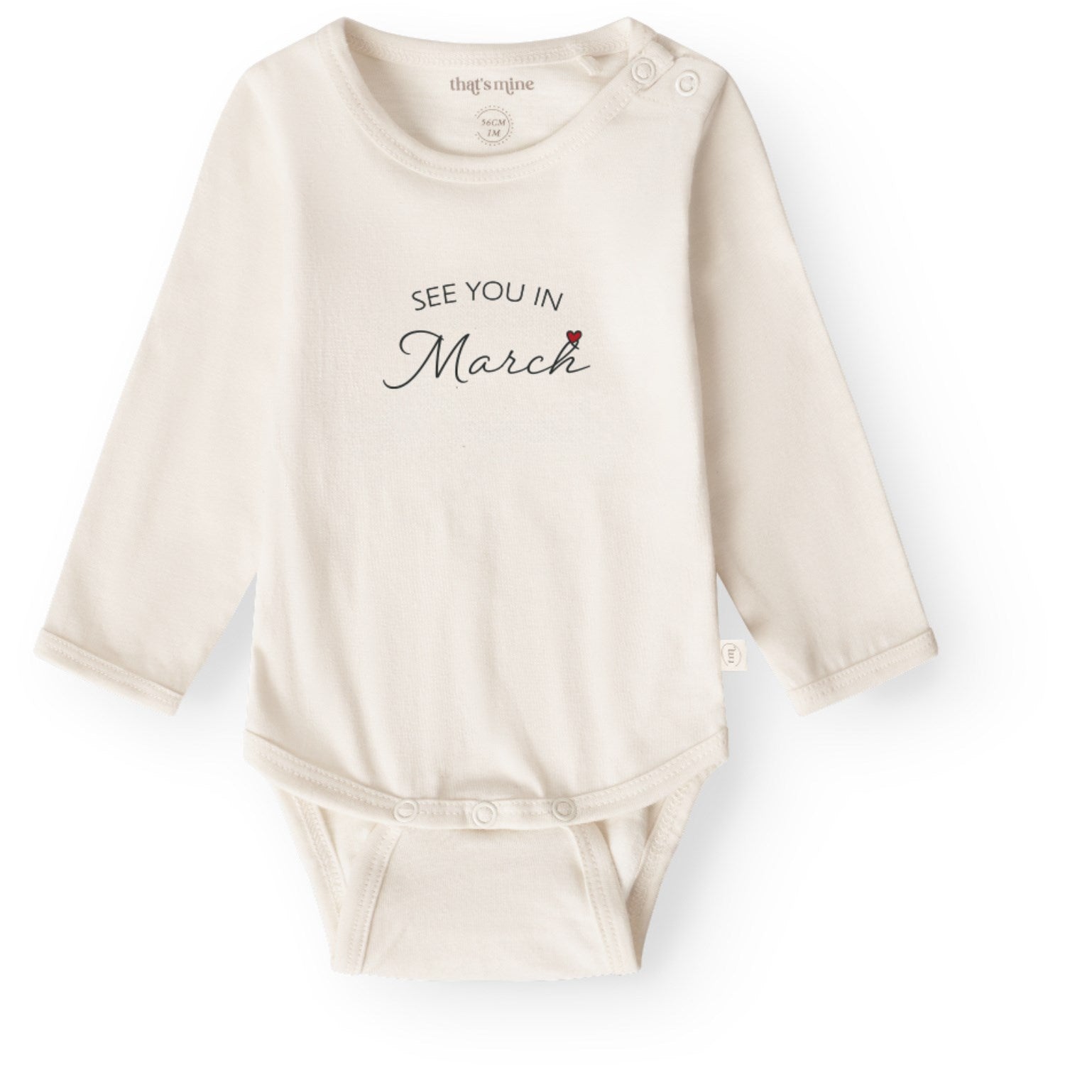 Feir ankomsten av den lille i mars med vår sjarmerende "See You In March" babybodysuit! Laget i mykt og behagelig materiale, er denne bodystockingen designet for å skape glede. Med sitt tiltalende mønster og friske farger, tilbyr den stil og komfort i ett. Enkel å vedlikeholde, denne bodyen er perfekt for hverdagsbruk og spesielle anledninger, og gjør den til en ideell gave for å overraske kommende besteforeldre og venner.