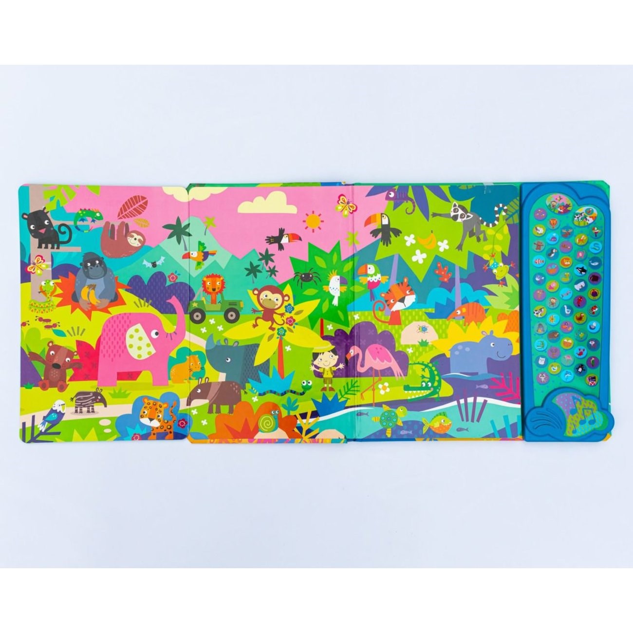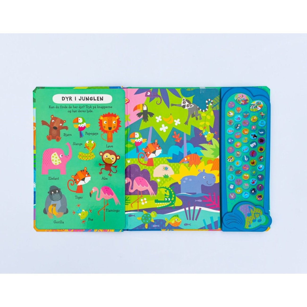 I den store Se og finn-boka vrimler det av alskens dyr: I jungelen, I havet, I skogen, Dyr på polene og På gården. Finn dyrene, trykk på lydknappen og hør hvordan dyrene sier! Med utfellbare sider og 50 dyrelyder.