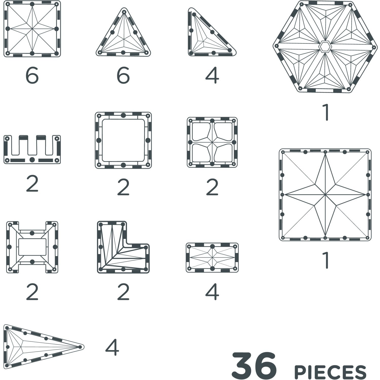Pakken består av 36 deler i myke pastellfarger som er både tiltalende og lette å håndtere for små hender. Lekene er laget av holdbare materialer som tåler både lek og læringsøkter gjennom hele barndommen. De magnetiske delene er sikre og enkle å sette sammen, og lar barnet ditt konstruere uten frustrasjon eller hjelp fra voksne.