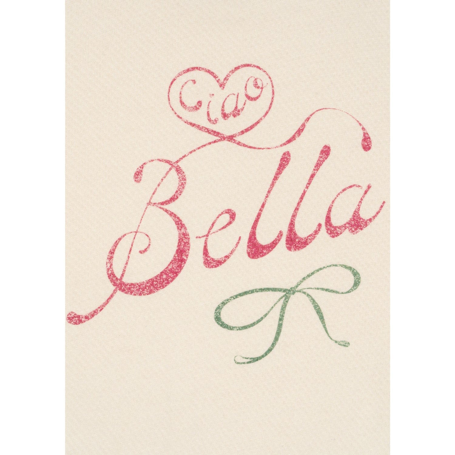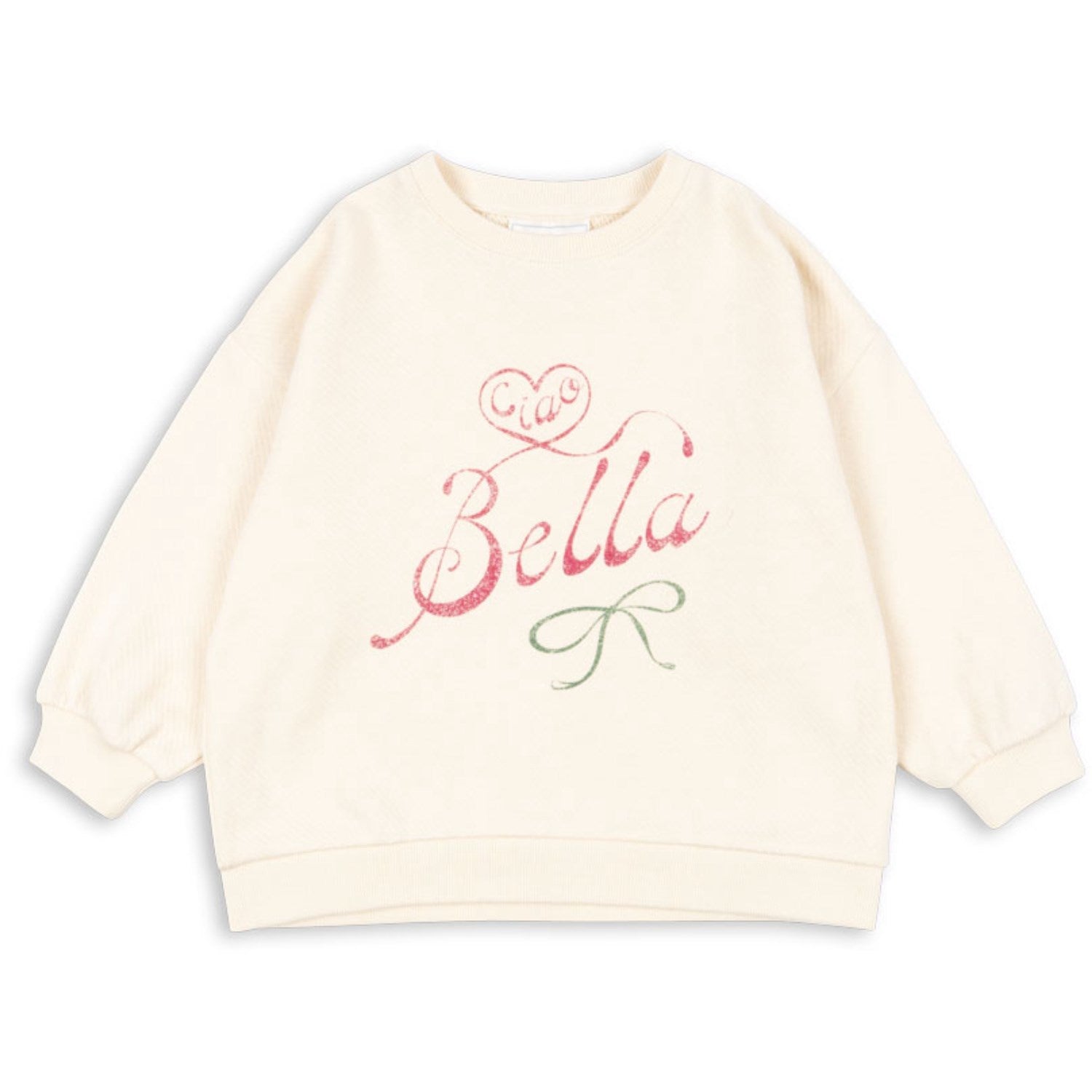 La barnet ditt kose seg med Konges Sløjd Antique White RHW X KS Bella Sweat Gots, en collegegenser som kombinerer komfort og stil. Dette plagget er fremstilt av myk økologisk bomullsjersey, noe som sikrer en behagelig følelse mot huden. Med sitt avslappende snitt med senkede skuldre og litt firkantet silhuett, tilbyr genseren en moderne og stilfull look. Genseren prydes av en sjarmerende sløyfe og "Ciao Bella"-signaturen foran, og legger til et lekent preg på barneantrekket. Denne allsidige og holdbare genseren er ideell for alt fra lek i parken til avslappede hjemmedager.