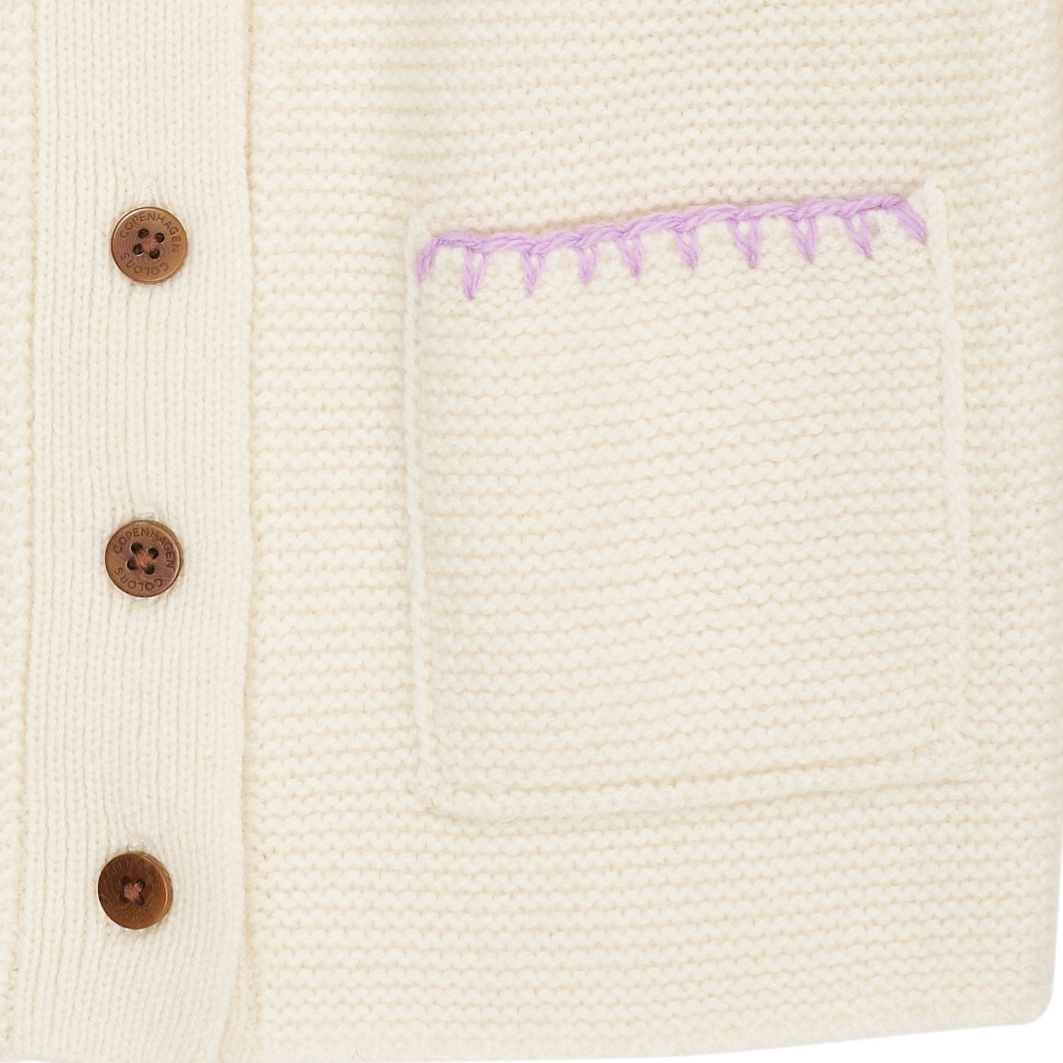Oppdag vår herlige strikkede cardigan fra COPENHAGEN COLORS, perfekt for kjølige dager. Laget av luksuriøs lammeull i krem- og lavendelfarger, denne cardiganen byr på en myk og varm følelse. Designet med praktiske knapper foran og en stilig skjerfdetalj i nakken, sikrer dette plagget en komfortabel og lett tilpasningsdyktig passform. Lett å ta vare på, denne cardiganen er ideell for hverdagsbruk og tilfører en sjarm til enhver barne-garderobe.