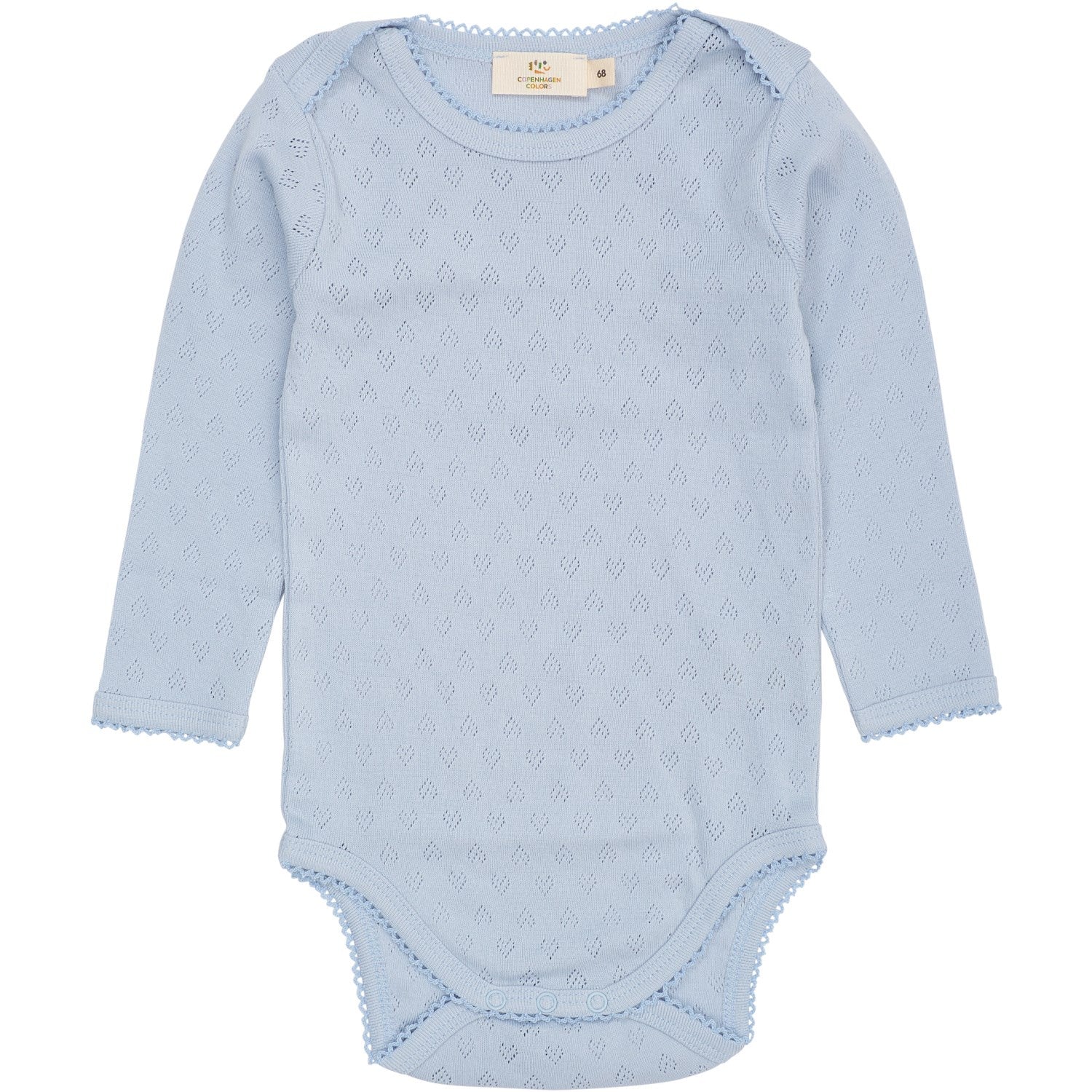 Denne COPENHAGEN COLORS bodyen i dusty blue er skånsomt designet med babyens komfort i tankene. Med sin unike lappehals gjør den påkledning enklere, og det raffinerte hjerteformete pointelle-mønsteret gir et søtt preg. Laget av 100 % økologisk bomull, er denne bodyen både myk og pustende, perfekt tilpasset delikat barnehud. Lange ermer og praktiske knapper mellom bena sikrer også praktisk skifting. En ideell kombinasjon av stil og funksjonalitet for din lille.