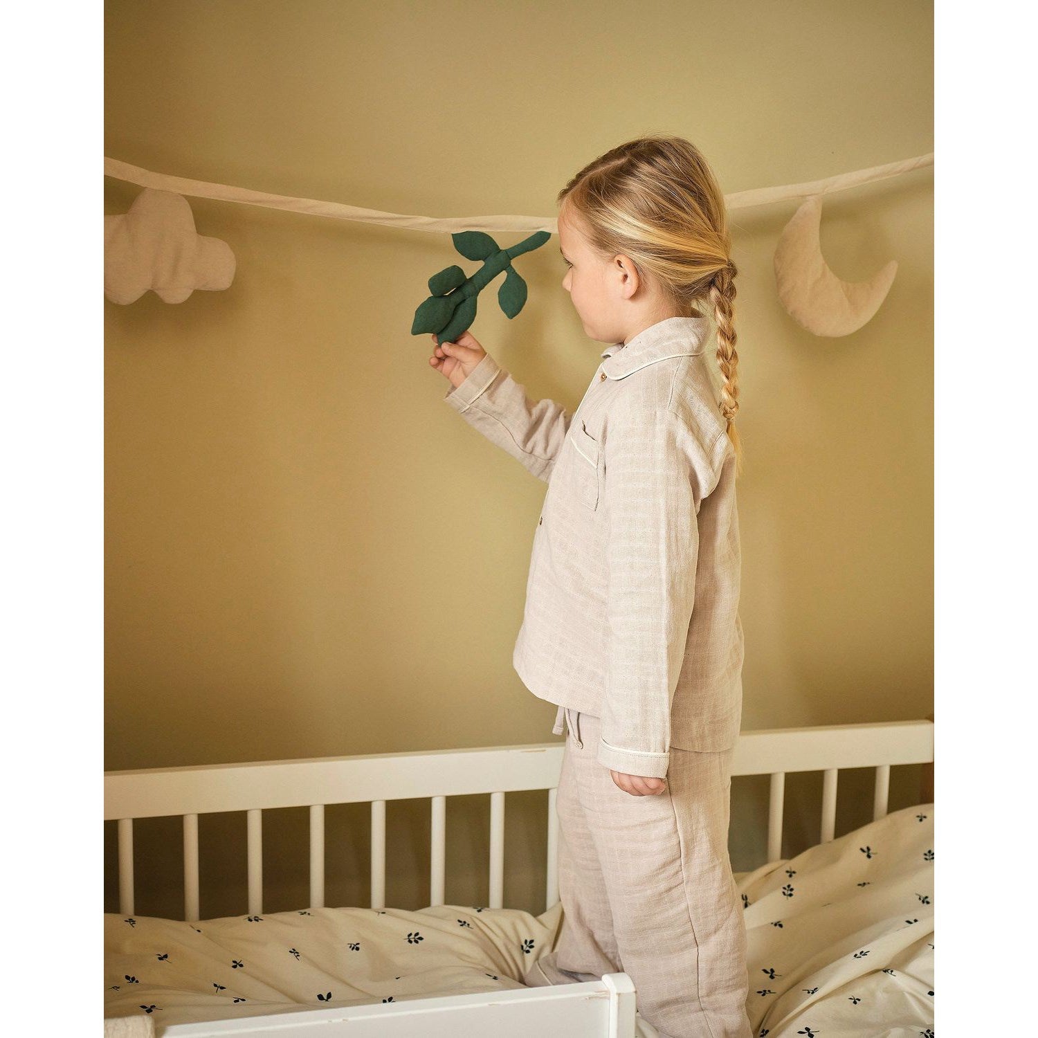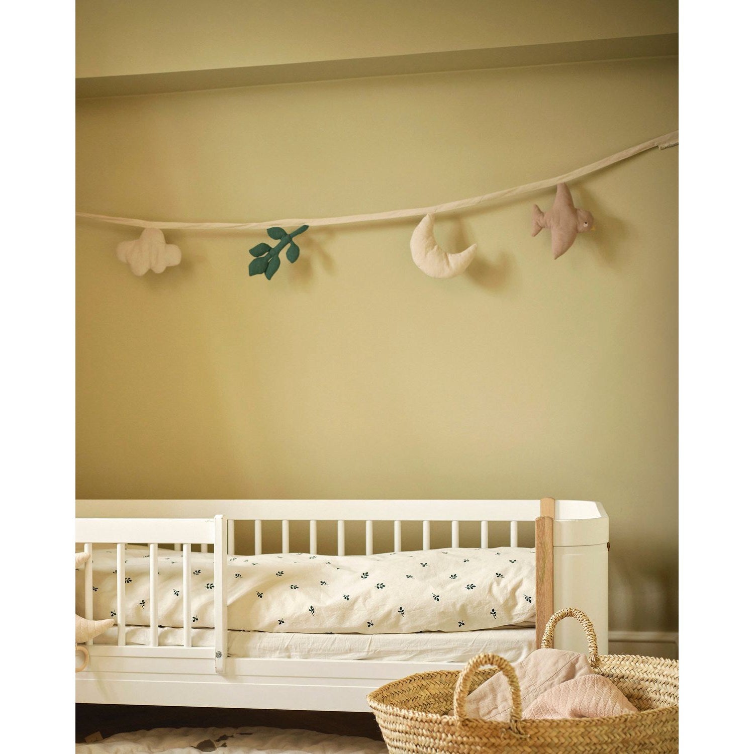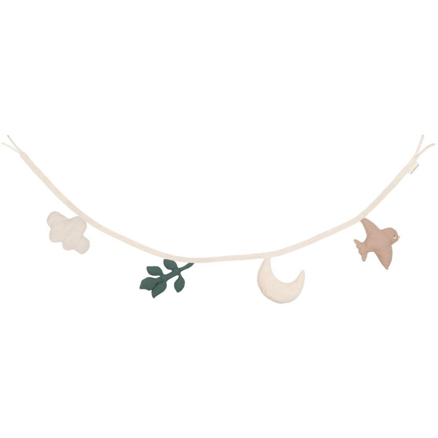 Opplev eventyret i hverdagen med Moonboon Nature Stofguirlande, en krans som omdanner barnerommet til et fantasifullt univers. Enten festet på veggen, svingende fra barnesengen, eller elegant plassert på en hylle, denne guirlanden, inspirert av H.C. Andersens "Ole Lukøje", inviterer til drømmerike stunder. Laget av myke, organiske materialer, sikrer den både sikkerhet og komfort. Figurene, bundet sammen i kjønnsnøytrale farger, er ikke bare dekorative, men også stimulerende, fremmende barnets fantasi og kreativitet. Medfølgende godnatthistorie beriker leggetid og tilbyr søte drømmer, året rundt. Materialer: Hovedmateriale: 100 % økologisk bomull. Fyll: 100% økologisk bomull Vaskeinstruksjoner: Ingen tørketrommel, Strykes på lav varme, 40 grader, Ingen blekemiddel, Ingen renseri, Sertifiseringer: GOTS Økologisk