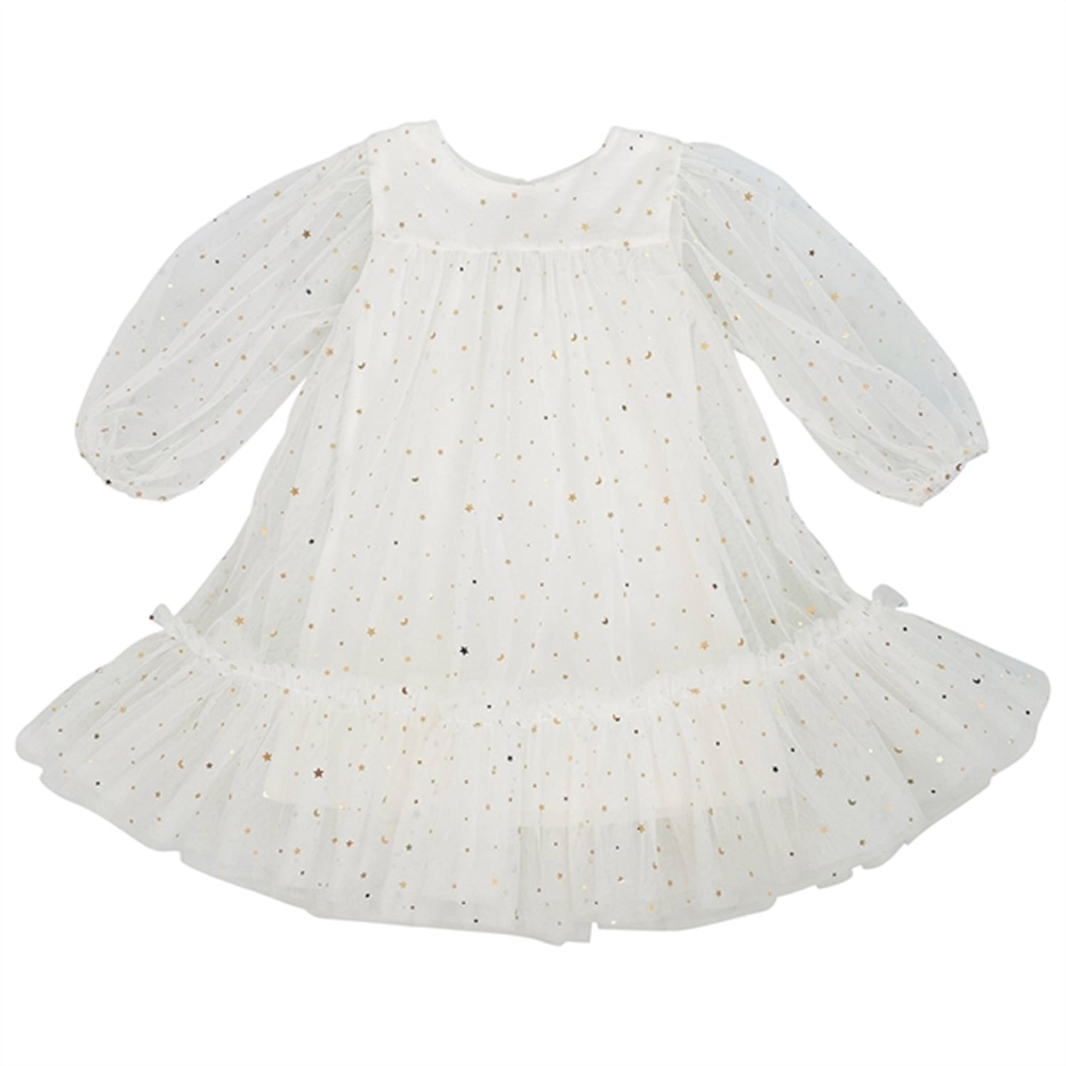 Kle den lille i nattehimmelens fortryllelse med "Dolly by Le Petit Tom Stars & Moon Empress Tylle Dress." Denne off-white tyllkjolen er et fantastisk tillegg til enhver garderobe, med et langermet design utsmykket med blinkende stjerner og måner som fanger kosmos underverk.