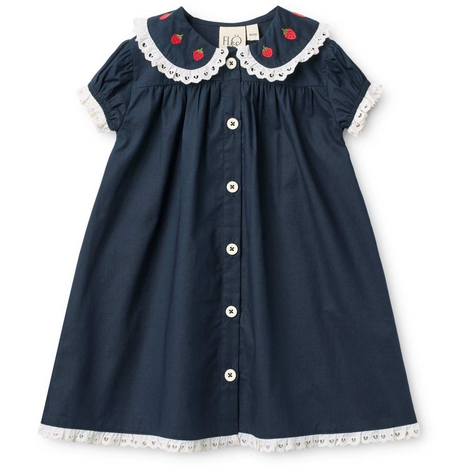 Kle din lille skatt i vår sjarmerende Aya-kjole fra Flöss New Navy. Dette plagget er nøye sydd i 100 % bomull, noe som sikrer både komfort og holdbarhet. Kjolen har et øyefangende design med en klassisk Peter Pan-krage, delikate jordbærbroderier, og søte puffermer som tilfører et spill av volum og stil. Den fine blusen er dekorert med blondekanter som gir en elegant touch ved krage, ermer, og nederst på kjolen. Praktisk knappelukking foran med runde plastknapper gjør den enkel å ta av og på. Denne kjolen kombinerer stil med funksjonalitet og vil holde din lille komfortabel gjennom alle deres eventyr. Ideal for både spesielle anledninger og daglig bruk.