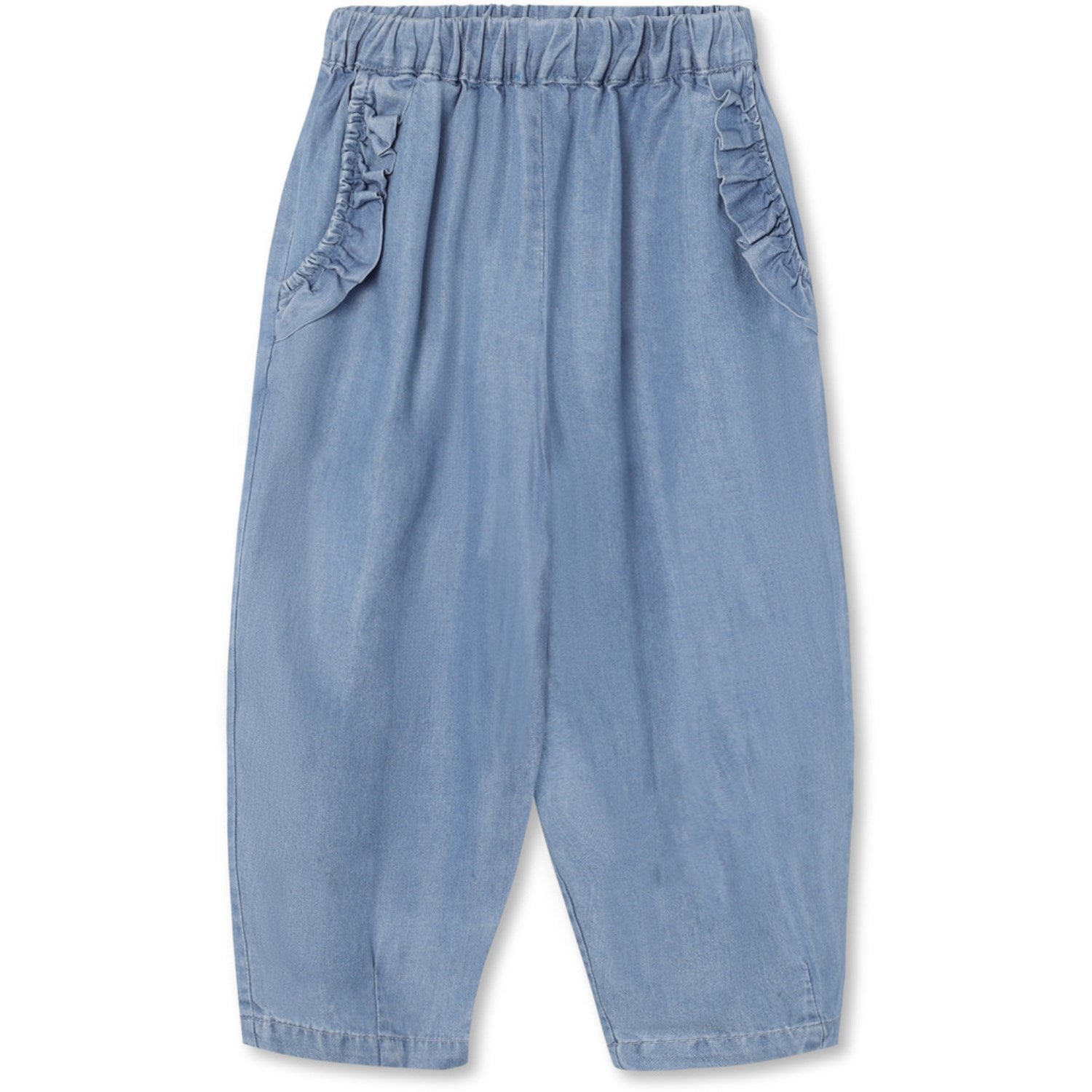 Oppdag de herlige 'Helene Bukser' i medium denimblå – et must for alle små moteentusiaster! Disse buksene er laget av 100 % Tencel, et materiale kjent for sin utrolige mykhet og holdbarhet. Designet er både stilig og komfortabelt med en casual passform og skjønne volanger. Denne modellen har skrå lommer foran og en sjarmerende lomme bak, alle utsmykket med volanger og et nydelig broderi av en hjerteballong.