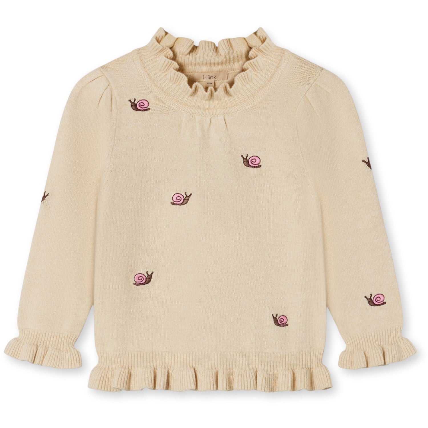 Oppdag vår nydelige Fliink Sandshell Alon Snail-bluse, designet med øye for detaljer og stil. Denne sjarmerende genseren er utstyrt med delikate volangdetaljer ved ermene, halsen og nederkanten, noe som tilfører et feminint og elegant preg. Overflaten er dekorert med små, sjarmerende sneglemotiver og har fine folder på skuldrene som skaper et lett volum i ermene.