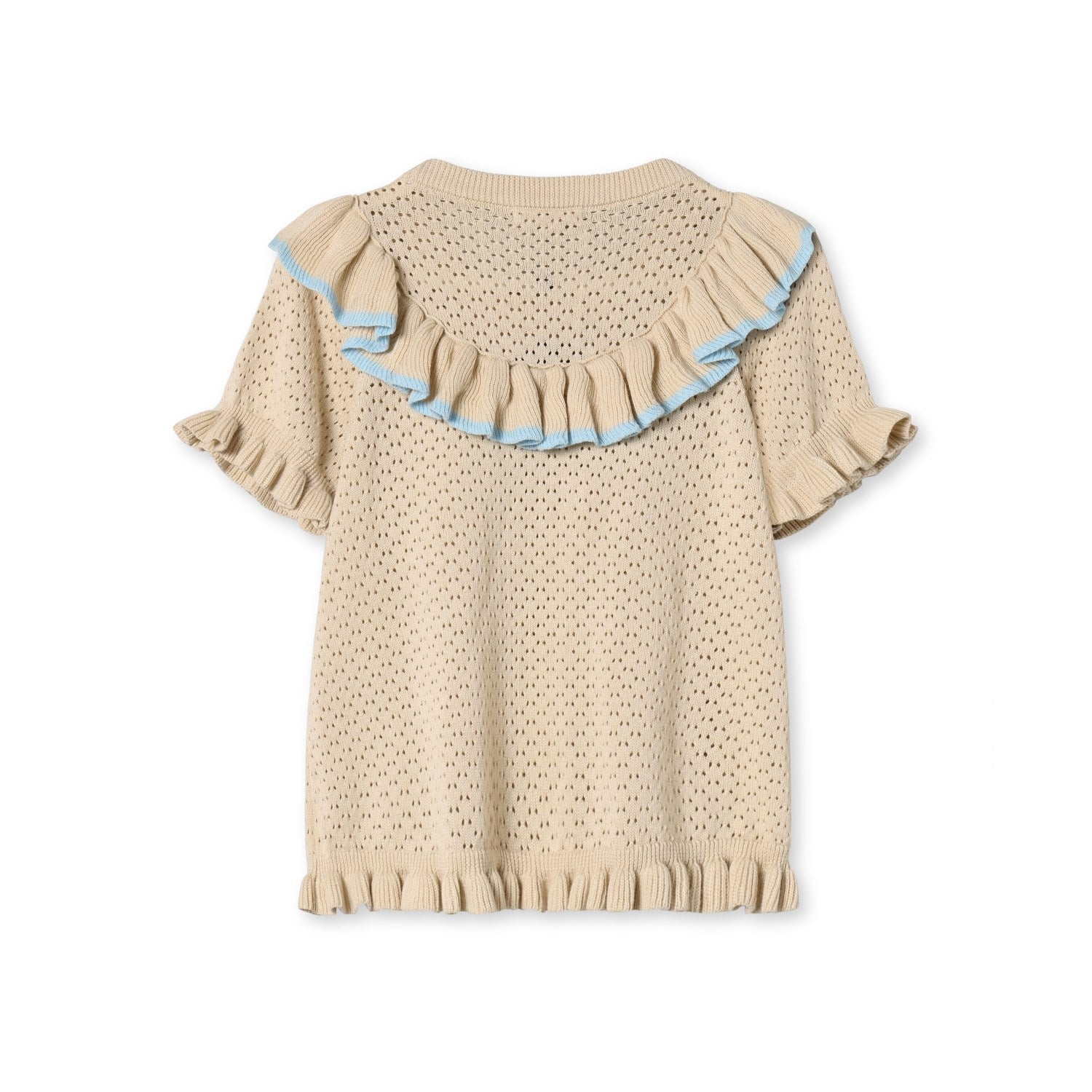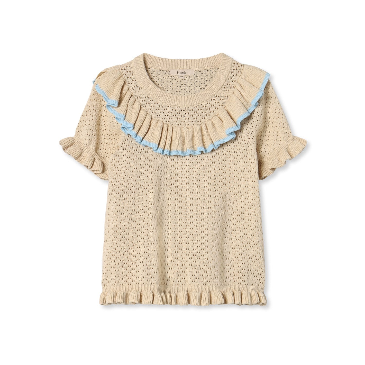 Gå inn i sødme med Fliink Sandshell Emmy Bluse! Denne kjære toppen er laget av 100 % økologisk bomull og har et intrikat pointellemønster med sjarmerende volanger som gir en leken vri. Den runde halsen og puffermene fremhever en lunefull silhuett, mens kontrasterende blå kanter på skuldervolanger skrur opp den søte faktoren. Denne blusen er perfekt for en piknik eller en fest, og gjør enhver dag spesiell. Hold den deilig lenger ved å vaske forsiktig og legge den flatt til tørk. En sann skatt i enhver smås garderobe!