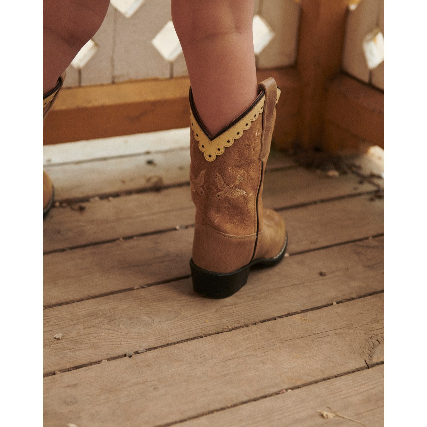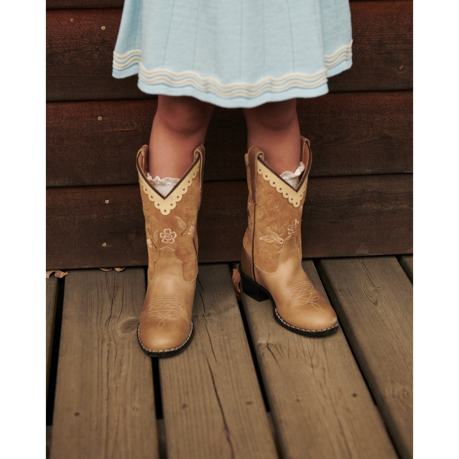Utforsk våre sjarmerende Copenhagen Colors Beige Suede Limited Cowboy Støvler High, en perfekt blanding av stil og komfort for de små. Denne unike fritidsskoen er skapt gjennom et spennende samarbeid mellom Bootstock og Copenhagen Colors, og viser en imponerende håndverkskvalitet med 100 % semsket skinn. Stilige detaljer som broderte duer og blomster pryder de lange skaftene, noe som legger et artistisk preg på det klassiske designet. Tilgjengelig i en nøytral beige farge, disse støvlene er like praktiske som de er vakre og tilbyr både komfort og holdbarhet for enhver situasjon. Ideelle for både festlige og hverdagslige anledninger, er de et must i enhver barnegarderobe.