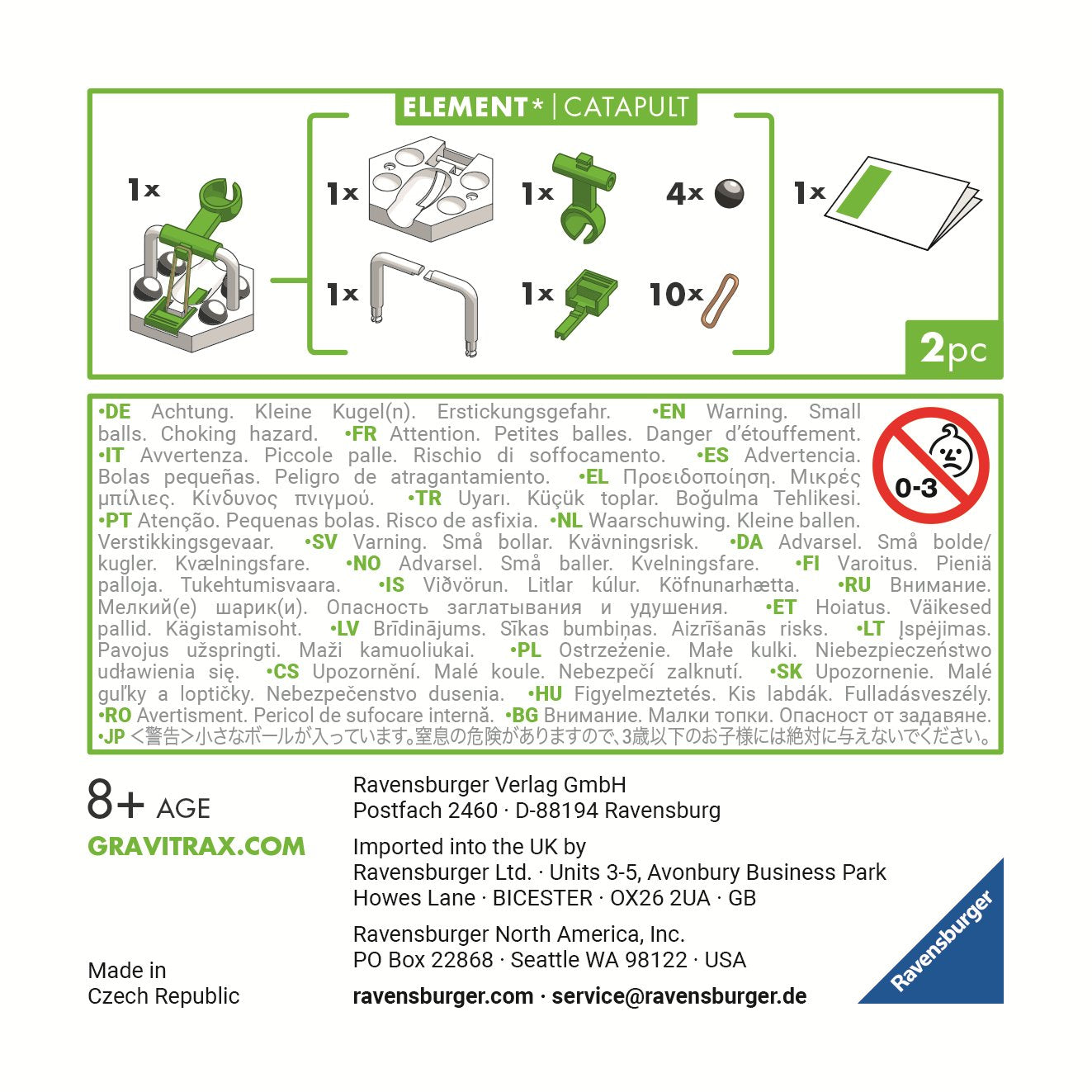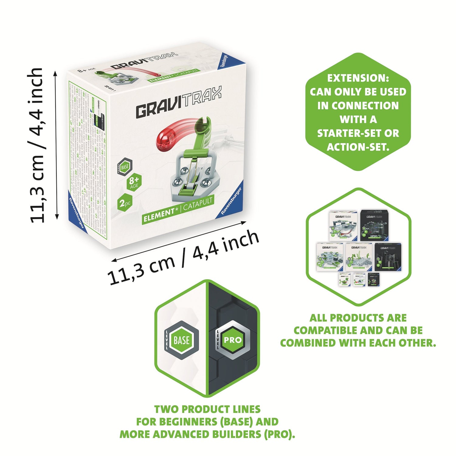 Tilbehøret består av 2 deler, inkludert en guide og en actionstein Catapult, samt 4 byggedeler med 1 Action Stone Catapult, 4 kuler, og 10 ekstra gummiringer. Dette gjør settet enkelt å bruke og bygge på med eksisterende GraviTrax-startsett for å skape flere spennende banekombinasjoner.