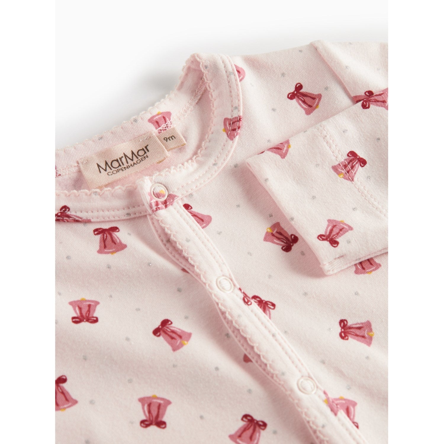 Oppdag vår myke og behagelige MarMar Modal Smooth Print Bells Ruka Onesie, perfekt for småbarn! Heldressen er fremstilt i elastisk trøye med elastan og er utmerket til daglig bruk takket være dens pustende egenskaper og evne til å beholde både form og farge. Delikate picot-sømmer tilfører et stilfullt preg. Alle materialer er dessuten Oeko-tex® sertifiserte, testet for skadelige kjemikalier, slik at du kan føle deg trygg når ditt barn utforsker verden i komfort. Materialer: 47% Modal 48% Bomull (Økologisk) 5% Elastan Vaskeinstruksjoner: Vask - Maskinvask 40 °C , Blekemiddel - Må ikke blekes , Tørking - Må ikke tørkes i tørketrommel, Strykes - middels, Renseri - Kjemisk rens mulig Sertifiseringer: OEKO-TEX, LENZING Modal, GOTS, SMETA Jersey med elastan Blød, elastisk og behagelig at have på Picot-sømme Åndbar kvalitet Holder formen og farven Oeko-tex® - Testet for skadelige kemikalier