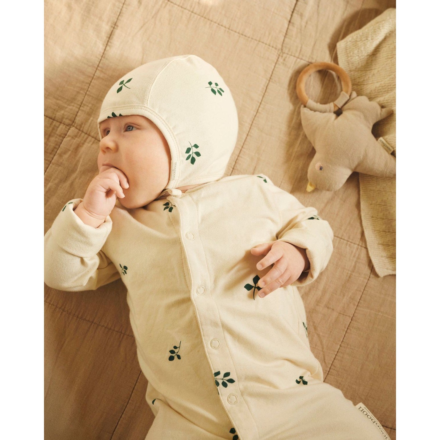 Oppdag gleden ved Moonboon Leaf Sparkedragt & Hue, et sjarmerende sett designet for å omslutte de minste i ren komfort fra første stund. Dette settet, nøye utformet i myke, organiske materialer, sikrer at din lille skatt forblir varm og behagelig fra topp til tå.