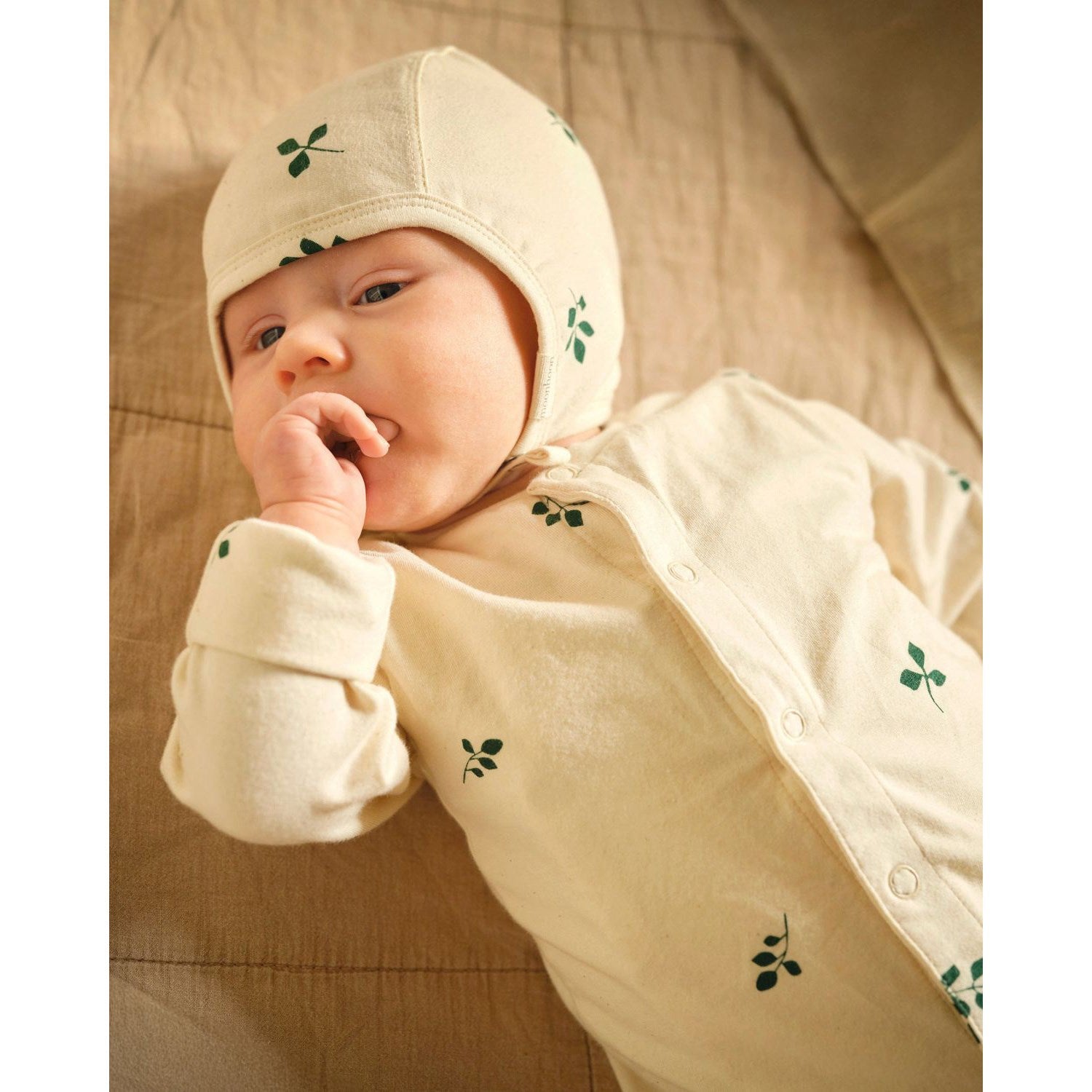 Hele settet, bestående av en sparkedrakt og en matchende lue, er laget i økologisk bomull som tillater fri bevegelse gjennom dagen. Funkjsonaliteter som sammenleggbare vottekanter og trykknapper forenkler påkledningen og øker komforten. Praktiske detaljer og den tiltalende estetikken gjør dette settet til et fremragende valg for daglig bruk eller som en gjennomtenkt gave.