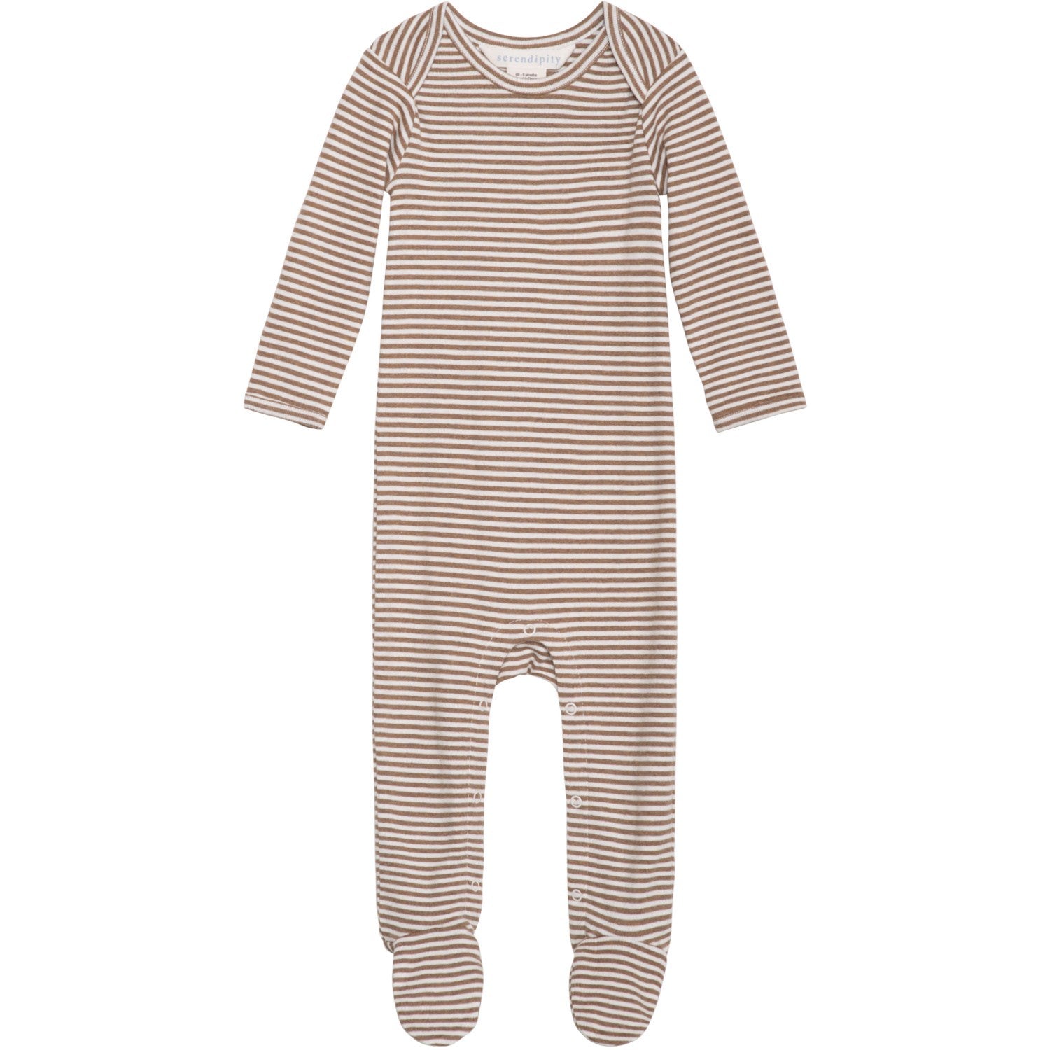 Innbydende og komfortabel, denne Serendipity babydrakten i striper av mandelbrun og offwhite er perfekt for din lille skatt. Laget av 100 % økologisk bomull med en myk mélert bomullsribbe, tilbyr den full bevegelsesfrihet med lange ermer og benutforming med føtter. Drakten har praktiske trykknapper ved bena og et smart konvoluttdesign ved halsen for enkle klesskift. Økologisk og GOTS-sertifisert, er dette et ypperlig valg for daglig bruk og spesielle anledninger.
