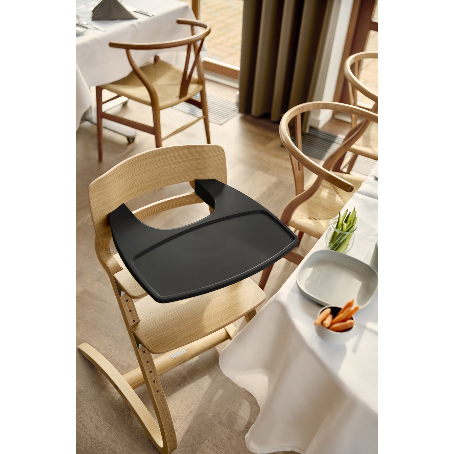 Gjør måltidene og lekestundene tryggere og mer underholdende med Leander Black Bakke til Leander Højstol. Dette brettbordet er skreddersydd for å passe perfekt til Leander høyestoler, og det monteres enkelt ved å klikke direkte på stolens sikkerhetsbrakett. Integreringen med sikkerhetsbraketten sikrer at det ikke oppstår noen sprekker hvor små fingre kan sette seg fast, noe som øker sikkerheten for ditt barn.