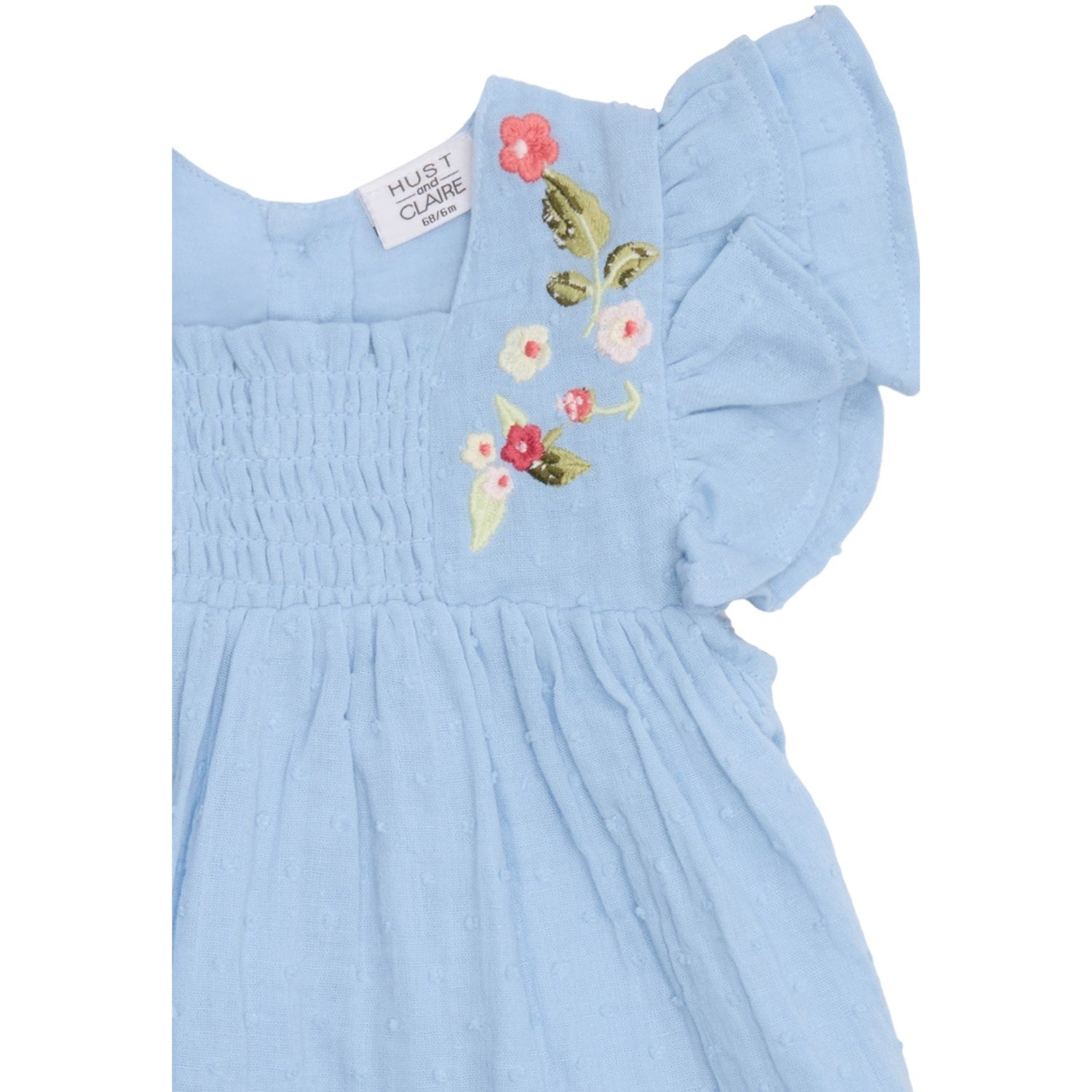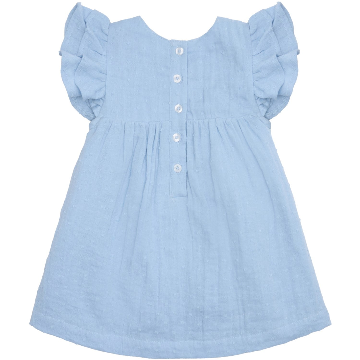 Gi den lille stjernen din en nydelig makeover med Hust & Claire Cloud Blue Katinka kjole. Denne sjarmerende vevde bomullskjolen har en firkantet hals, romantiske volangermer og er vakkert dekorert med fine broderte blomster. Det elastiske vaffelsømmen på brystet og snittet i midjen gir ekstra vidde, som sikrer en fortreffelig passform. Fullført i 100% økologisk bomull, er denne kjolen ikke bare stilfull, men også behagelig og miljøvennlig.