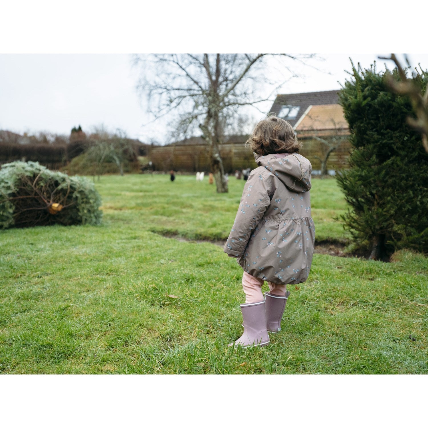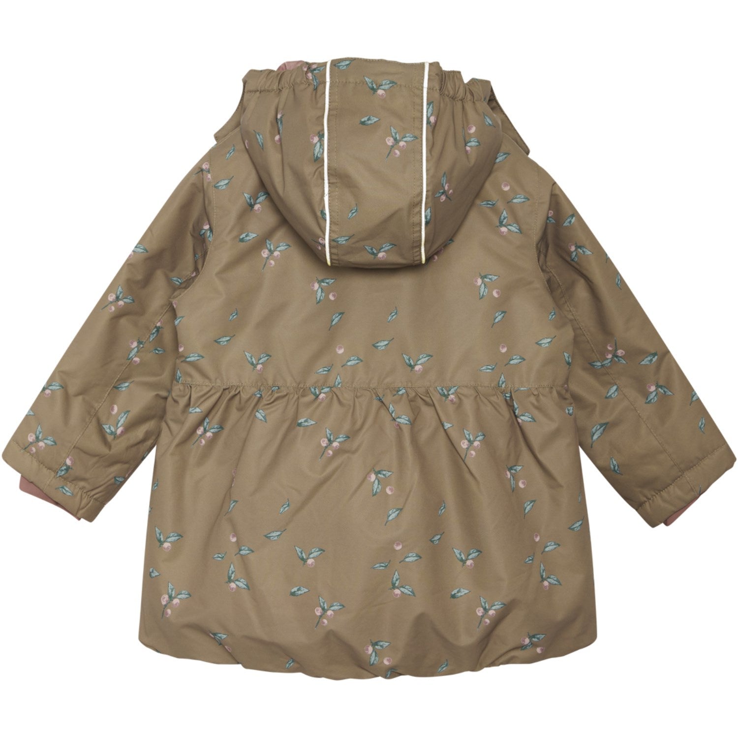 Jakken er tilgjengelig i tre sjarmerende design: et med bladtrykk, et med blomstertrykk og et med bærtrykk, noe som gjør den både leken og trendy. Den er konstruert med en smart snøfang ved ermene som inkluderer et lite hull for tommelen for å holde hendene varme og beskyttede. Rynkedetaljene i midjen på baksiden tilfører et elegant preg.
