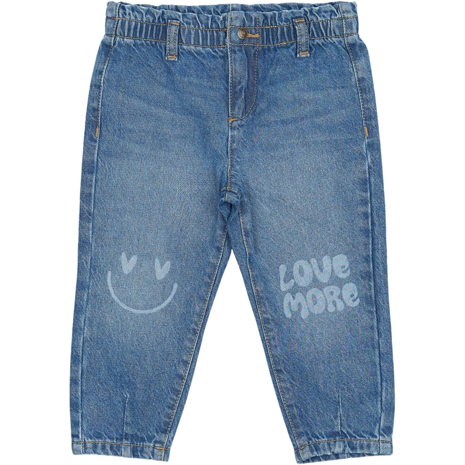 En munter detalj er smilefjeset trykket på det ene benet og oppmuntrende "Love More" på det andre, noe som legger til en unik touch som skiller seg ut i barnegarderoben. Ideell for alt fra skole til lekdate, disse buksene balanserer komfort og kul stil som vil få barnet til å smile bredt. Vask ved mild temperatur for langvarig bruk.