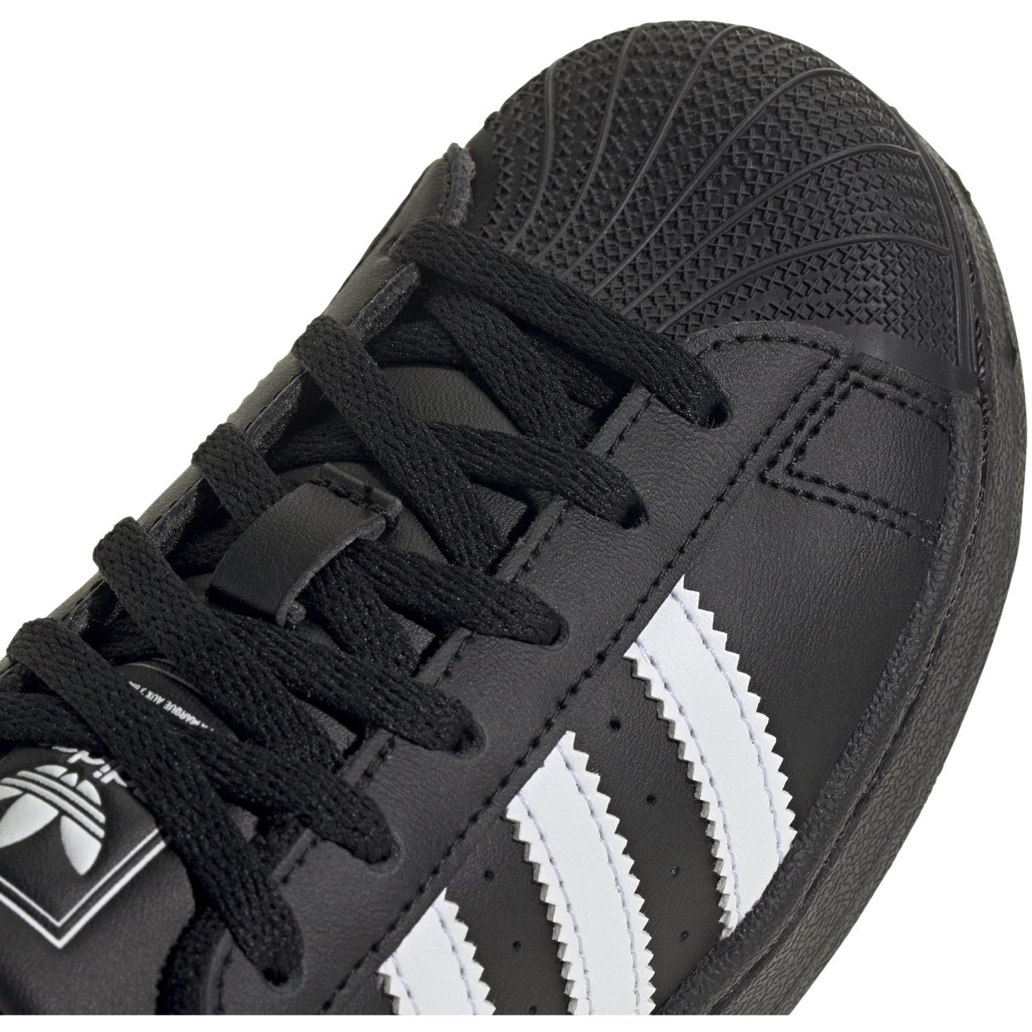 - Ekstra: Taggete 3-striper, Superstar-bokslogo på pløsen, Trefoil-logo på hælfliken.