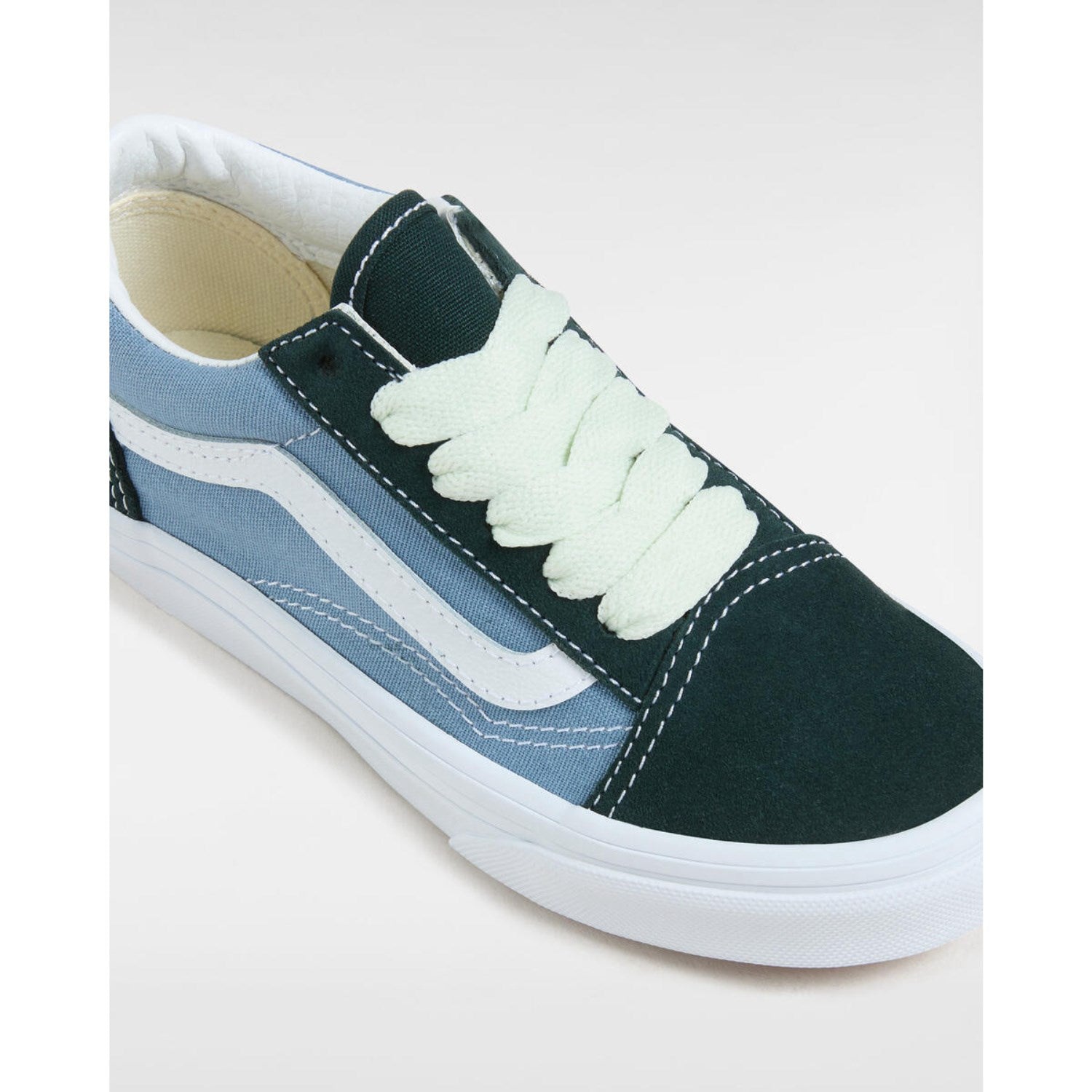 Oppdag de ikoniske VANS Green/Blue Old Skool 2-Tone sneakersene - perfekte for lekne barn! Disse skoene er laget av holdbart materiale med et stilig tofarget design i grønt og blått. Med en komfortabel passform, disse sneakersene støtter barnets føtter hele dagen. De er enkle å vedlikeholde og ideelle for enhver aktivitet, enten det er i skolegården eller under familieutflukter. Gi barnet ditt stil og komfort med et trykk av klassisk VANS-merket.