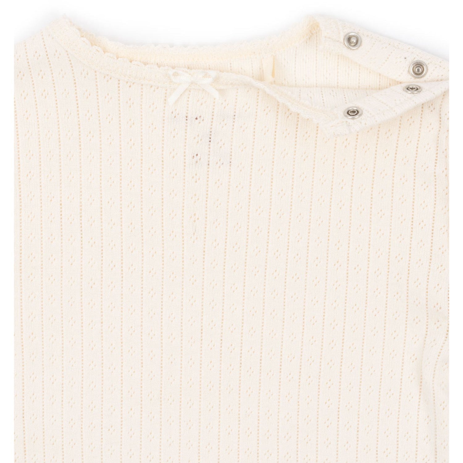 Oppdag Konges Sløjd Antique White Minnie Body, perfekt for din lille skatt. Denne sjarmerende bodyen er laget av 100 % økologisk bomull, GOTS-sertifisert, og lover både komfort og kvalitet. Med sitt delikate pointelle-design og praktiske trykknapper i skrittet, sikrer den enkel påkledning og en behagelig passform. Bodyen er en essensiell del av barnets garderobe, ideell for både hverdagsbruk og spesielle anledninger.