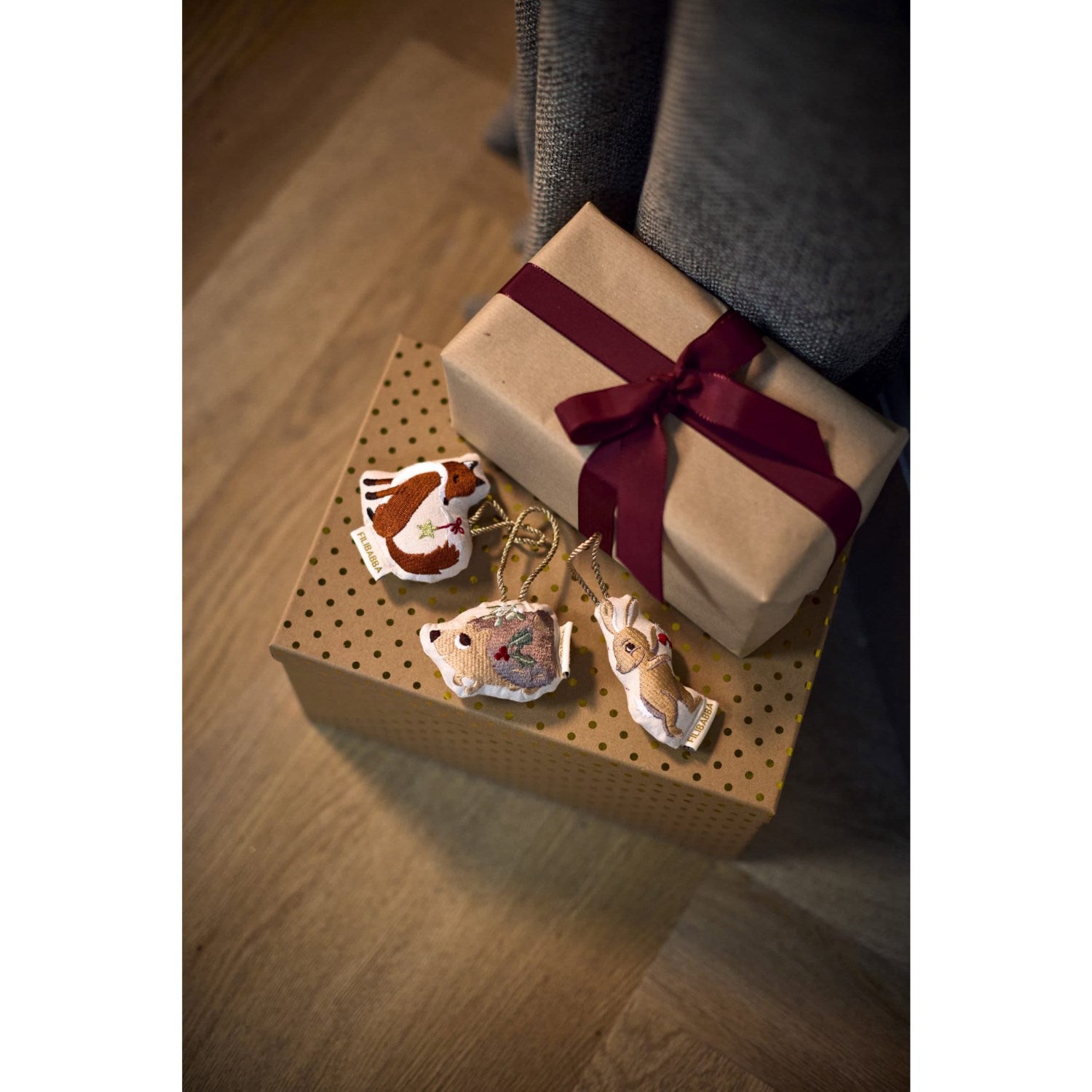 Gjør barnas rom magisk denne vintersesongen med FILIBABBA Forest Friends Broderte Vinterdekorasjoner. Disse sjarmerende julepyntene, designet med tanke på både estetikk og funksjonalitet, bidrar til å skape en følelse av varme og eventyr. Hvert dekorasjonselement er nøye utformet med myke stoffer og detaljerte broderier som fremkaller vintersesongens ånd. Våre kjærlig lagde figurer - en grasiøs rev, en dansende hare, og den bedårende pinnsvinet Henning - er ikke bare vakre, men også stimulerende for barnets fantasi, og inviterer til fortellinger og lek. Heng dem enkelt opp med de glitrende, gylne snorene og skap en innbydende atmosfære i enhver setting. Med inkludert oppbevaringspose i økologisk bomull, er disse vinterdekorene både lett å lagre og bærekraftige, perfekte for å bevare deres kvalitet år etter år. Gled deg over hvordan disse dekorasjonene beriker barnets miljø, ved å tilføre både komfort og et vakkert visuelt innslag som stimulerer sansene. Merk: Disse dekorative elementene er ment for dekorasjon, ikke lek.