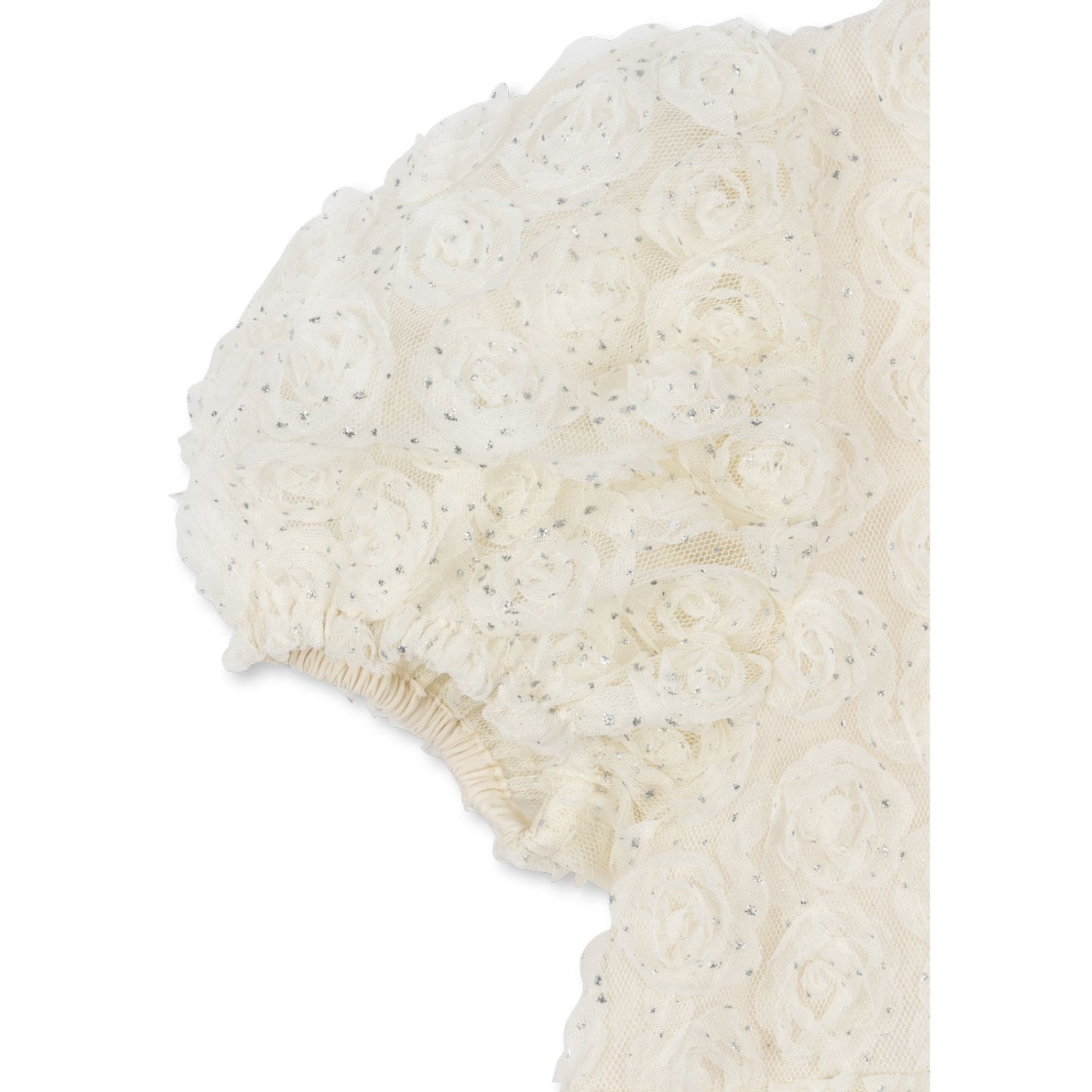 Oppdag en drøm av en kjole fra Konges Sløjd: "Ally Kjole" i antikkhvit. Dette elegante plagget prydes av puffermer og flerlag med tyll som skaper et vidunderlig volum. Designet er videre forhøyet med glitrende blomsterapplikasjoner som vil fange alles øyne. Den er fôret med myk bomull, som sikrer en behagelig passform og følelse. Perfekt for enhver spesiell anledning, denne kjolen kombinerer stil med komfort og holdbarhet, ideell for livlige barn som elsker å utforske verden med stil.