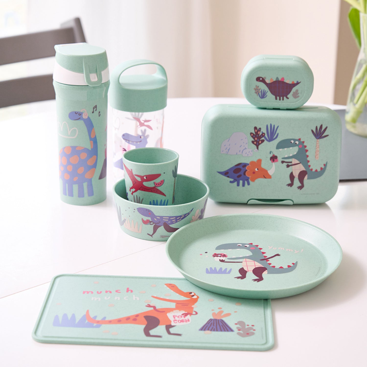 Oppdag det sjarmerende Koziol Organic Sage Green Small spisesettet med temaet "Connect Rex"! Dette settet, med livlige dinosaurillustrasjoner, vil garantert fange barnets interesse og gjøre måltidene til en morsom opplevelse. Designet er optimalt tilpasset små barn med elementer som en praktisk tallerken, en dyp skål, og en spesielt utformet kopp uten håndtak, perfekt for små hender å gripe.