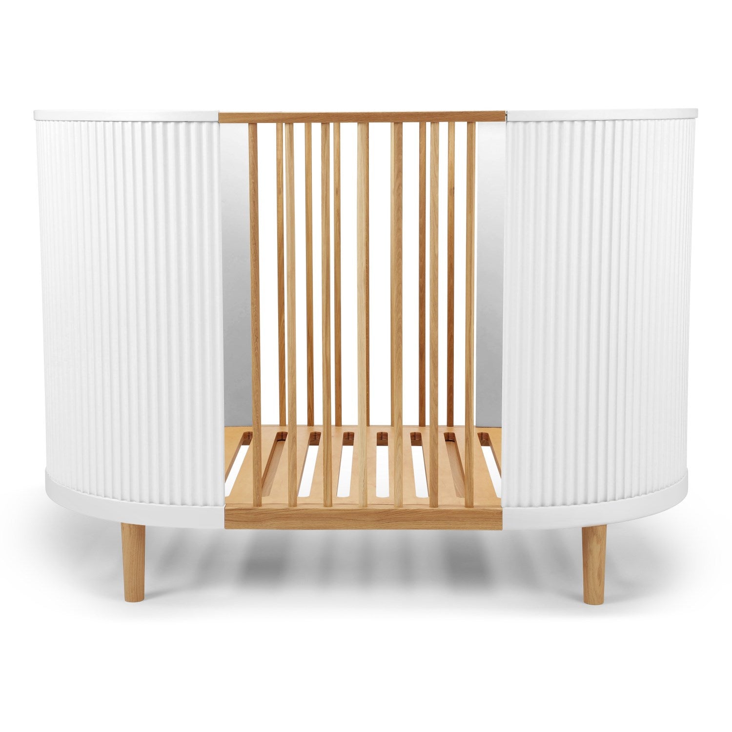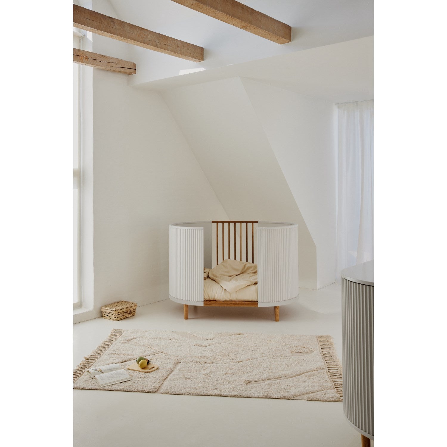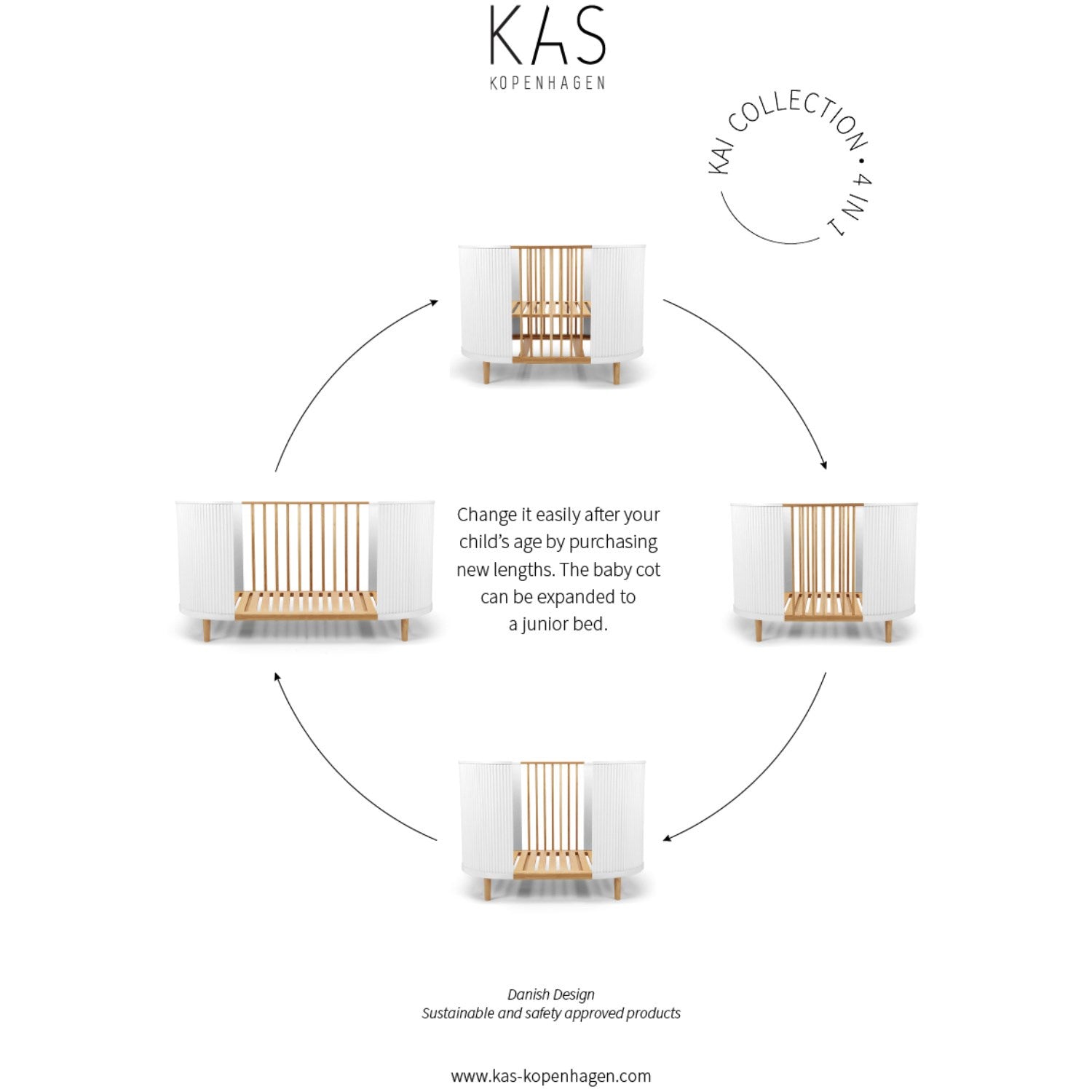 La ditt barn vokse opp med KAS Kopenhagens White Oak Kai Baby Cot, en sprinkelseng som forener tidløs design med moderne sikkerhet og funksjonalitet. Denne elegante, ovale sengen har en høydejusterbar sengebunn som enkelt kan tilpasses et voksende barn, med mulighet for å senke eller heve i to ulike høyder. Disse funksjonene sikrer at smårollingen din sover trygt og komfortabelt gjennom ulike livsstadier. Kai Baby Cot er designet med barnets utvikling i fokus; den kan transformeres til en juniorseng ved å fjerne sidene, noe som oppmuntrer til selvstendighet når barnet er klart for det. Med subtildesignelementer som doriske søyler og koniske ben, tilfører denne barnesengen et sofistikert preg til ethvert barnerom. Denne sengen er grundig testet og oppfyller strenge EU-standarder for barnesikkerhet og materialkvaliteter, inkludert EN 716 og EN 71, som verifiserer at alle materialer er trygge for barn. Den leveres også flatpakket, noe som minimerer CO2-utslipp under transport, og støtter vår innsats for en mer bærekraftig framtid. Gi ditt barn en perfekt start på livet med en seng som ikke bare ser godt ut, men også fremmer en sunn utvikling og varer i mange år.