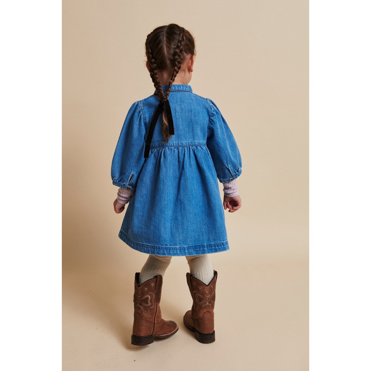 Oppdag vår sjarmerende dongerikjole i indigoblått fra COPENHAGEN COLORS, perfekt for aktive små. Kjolen er designet med trendy puffermer og praktiske trykknapper langs brystet, og er fremstilt i 100% økologisk bomull. Trekvart ermene tilbyr både stil og komfort, og gjør denne kjolen til et yndet valg for alle anledninger. Sørg for at din lille er både stilfull og komfortabel i denne allsidige og miljøvennlige kjolen.