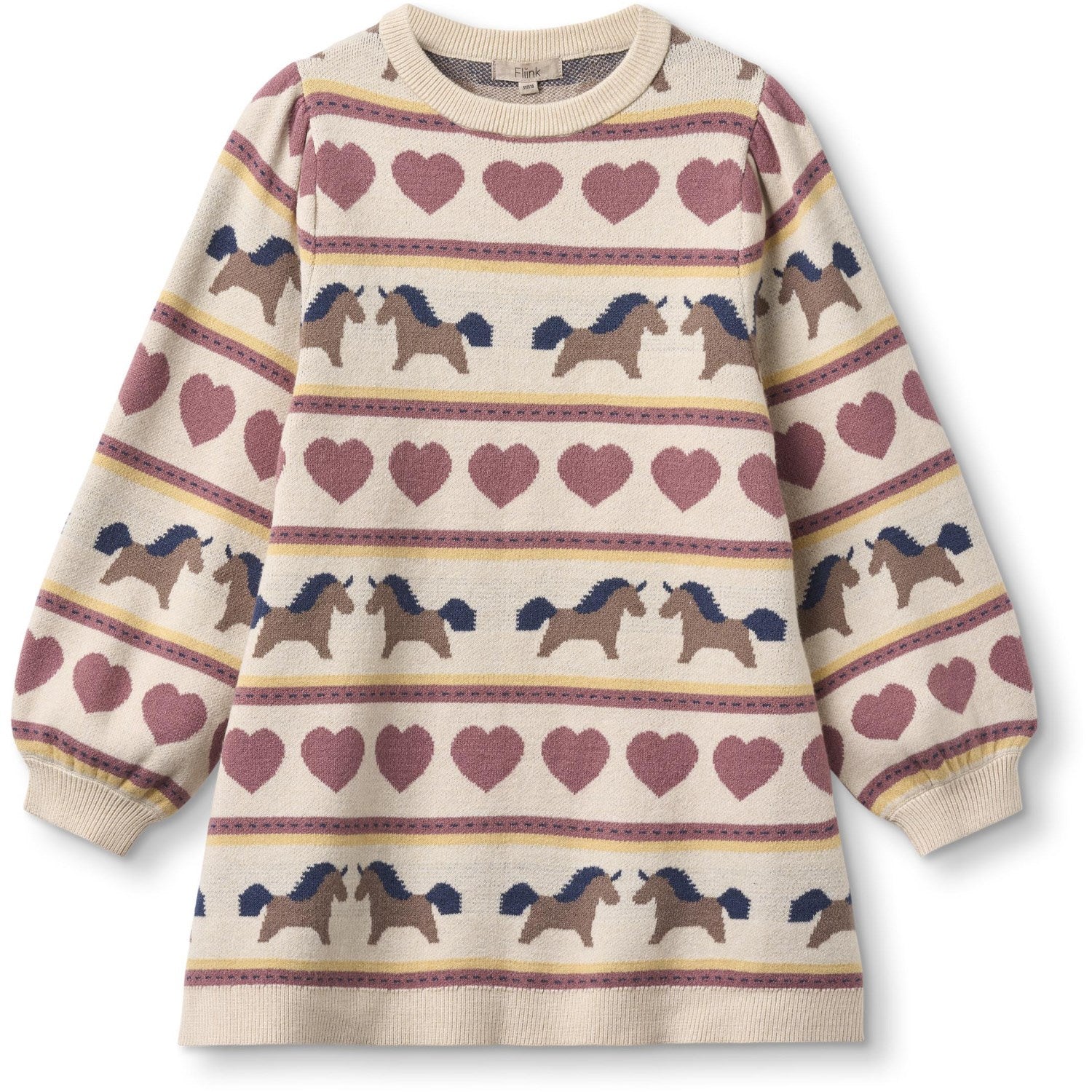 Denne sjarmerende Fliink Sandshell Kino Ls Multi Kjole er perfekt for de kjølige dagene. Kjolen er laget av en behagelig blanding av 50% LENZING™ ECOVERO™ viskose, 27% nylon og 23% polyester, som garanterer både komfort og holdbarhet. Med sitt lekne heste- og hjertemønster, samt en avslappet passform med lett puffede ermer og ribbekanter, kombinerer den stil med funksjonalitet. Kjolens allsidighet gjør den ideell til alt fra hverdags til festlige anledninger. Vask ved 30°C på skånsom syklus for enkel vedlikehold.