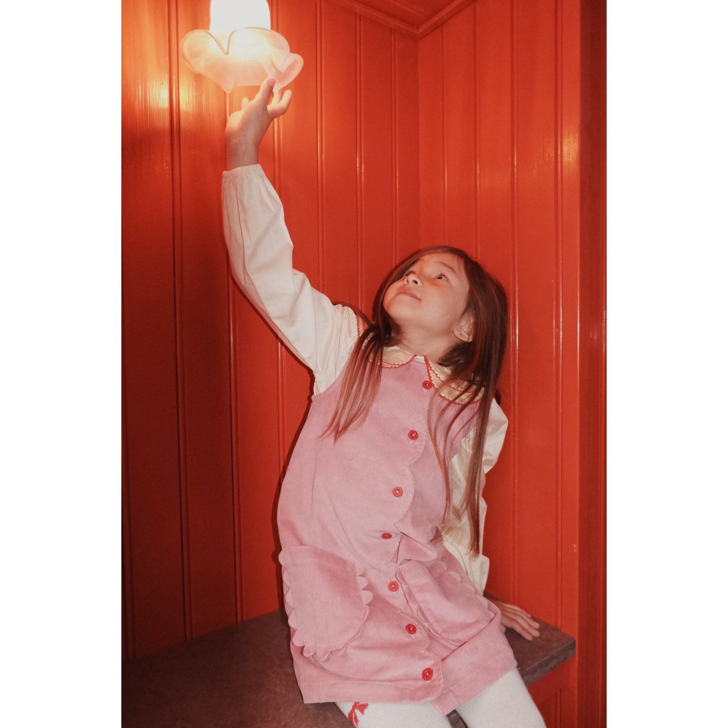 Oppdag den sjarmerende Flöss Velvet Rose Mia Kjolen, perfekt for enhver anledning. Denne kjolen i bomullsfløyel fremhever en rund hals, praktiske frontlommer dekorert med søte kamskjellkanter og iøynefallende røde kontrastknapper. Komfortabel og stilig, kjolen kan enkelt matches med en vevd bluse for et helhetlig uttrykk. Mia Kjolen er ikke bare vakker å se på, men også lett å ta vare på, og sikrer at de små ser pene ut uten stor anstrengelse.