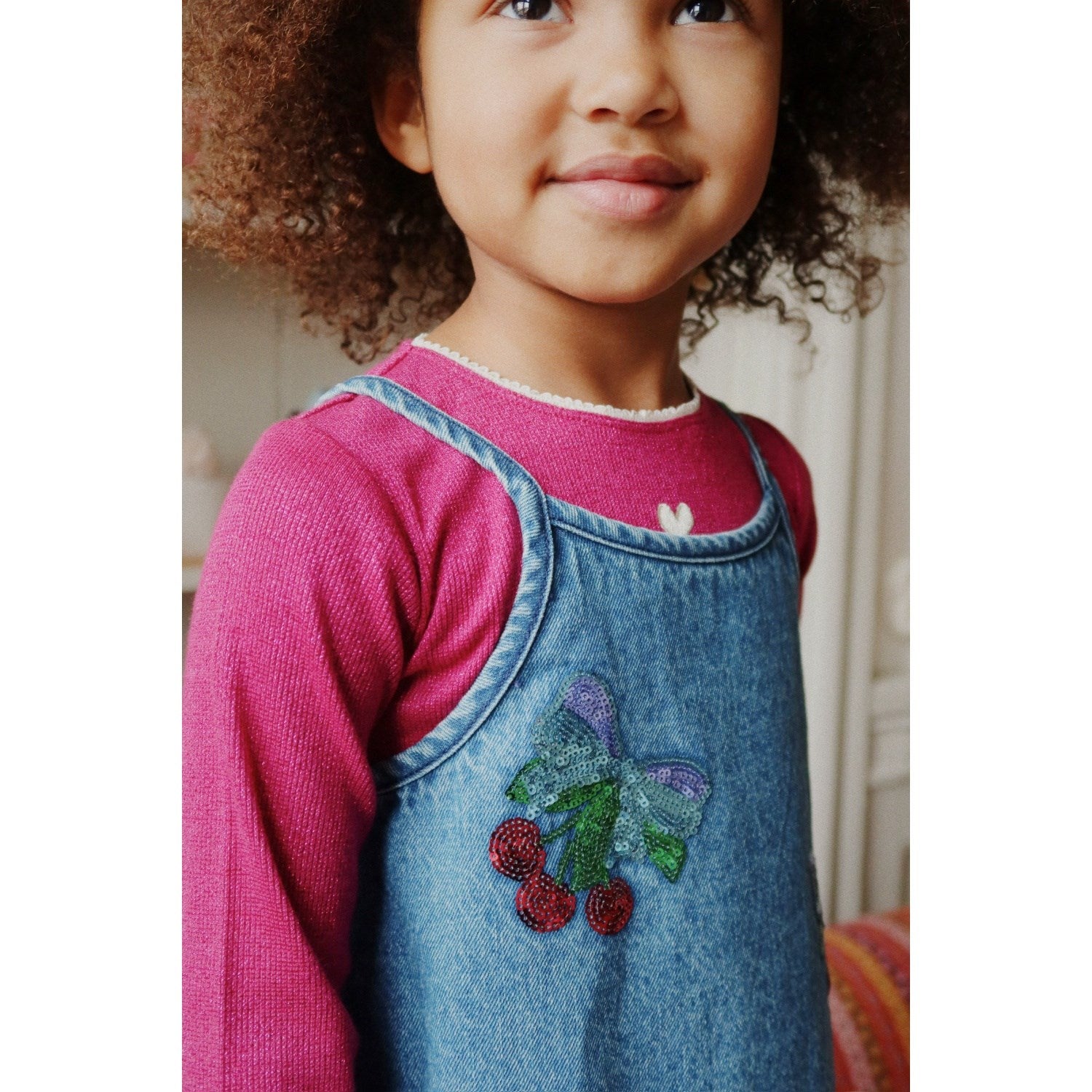 Oppdag den sjarmerende Konges Sløjd Amarena Sequin Magot Paljet Stropp Kjole - en ekte stjerne i barnegarderoben! Denne kjolen har stilige denimstropper og er dekorert med øyevennlige broderte paljettkirsebærsløyfer, perfekt for enhver festlig anledning. Produsert i 100 % økologisk bomull, garanterer vi både komfort og holdbarhet. Med GOTS-sertifisering kan du være trygg på at kjolen er laget under strenge miljøstandarder, og økologisk sertifisert av CU1094701. Den er ideell for barnets følsomme hud og enkel å vedlikeholde, men husk å vaske den separat på grunn av fargeblødning. Legg til et touch av magi og etisk mote i barnets garderobe med denne unike kjolen.