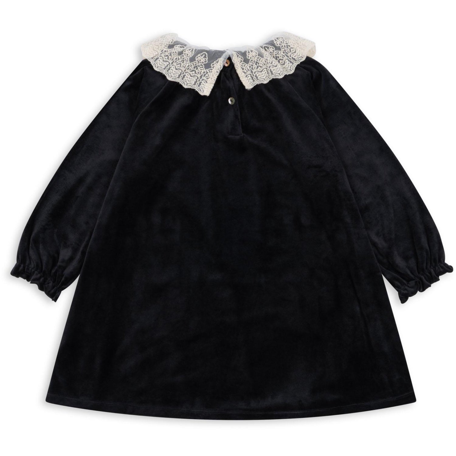 Gi den lille et stilfullt antrekk med Konges Sløjd Black Venola Kjole. Denne sjarmerende kjolen er laget i myk fløyel og har en dekorativ blondekrage som tilfører en herlig detalj. Kjolens løse, a-formede silhuett sørger for full bevegelsesfrihet, mens det holdbare materialet består av 80 % GRS-sertifisert polyester. Lett å ta av og på samt komfortabel å bære – perfekt for enhver anledning.